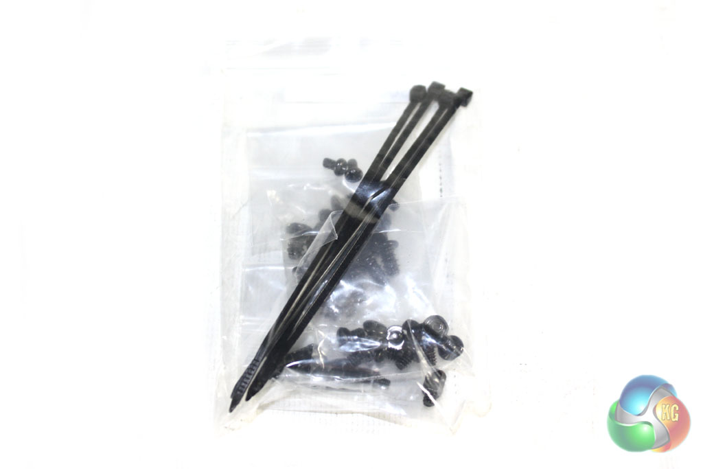 Inside the box, we find a fairly limited bundle of accessories which is comprised of the screws required for installation and a few cable ties.
