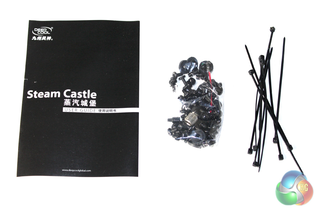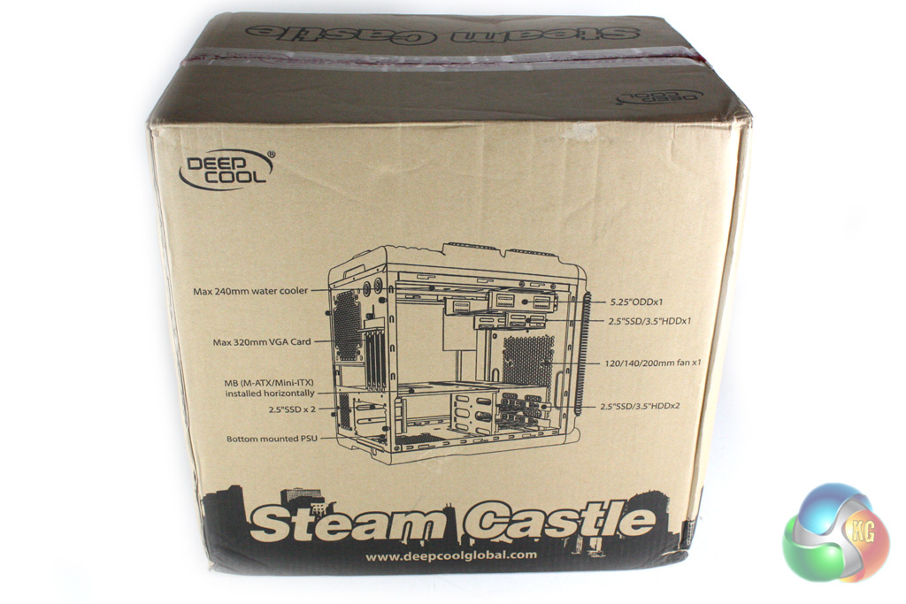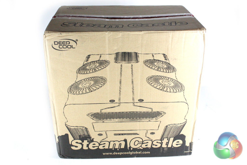 The Deep Cool Steam Castle is supplied within a fairly sizable brown cardboard box which reflects the size of the case within. The front of the box is decorated with an outline image of the top of the case, highlighting the four turret vents which feature in the roof of the unit.