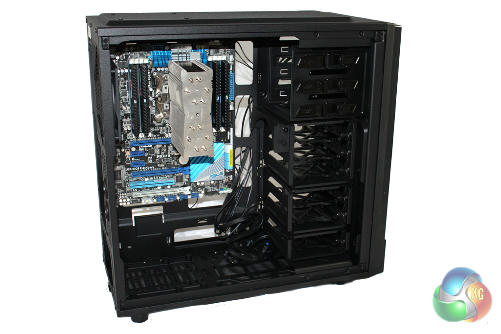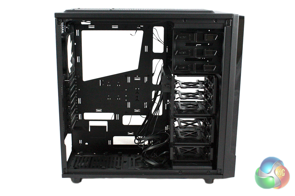 The internal layout of the case is standardised, with the modular hard drive bays located on the right hand side, below the external drive bays at the top. Each hard drive bay features a tray which allows you to install either a 2.5” or a 3.5” unit. There are six bays in total which are arranged in modules of three, two and one so that you can remove surplus bays to improve airflow.