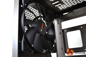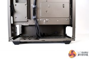 Ample space for storage devices is provided in the Pure Base 500. A double HDD cage is hidden underneath the PSU shroud and, as the name suggests, it fits up to two 3.5” drives. The HDD cage can be placed in three positions to provide extra clearance or removed completely.