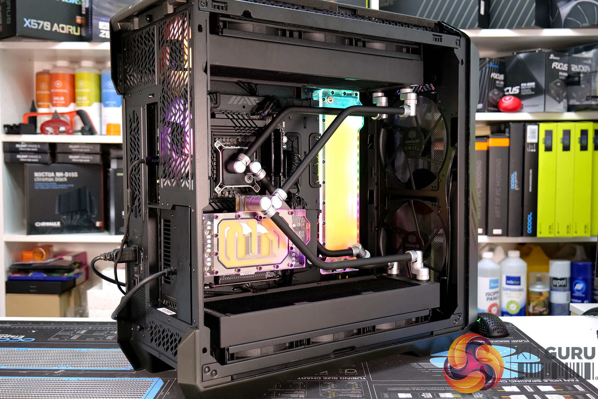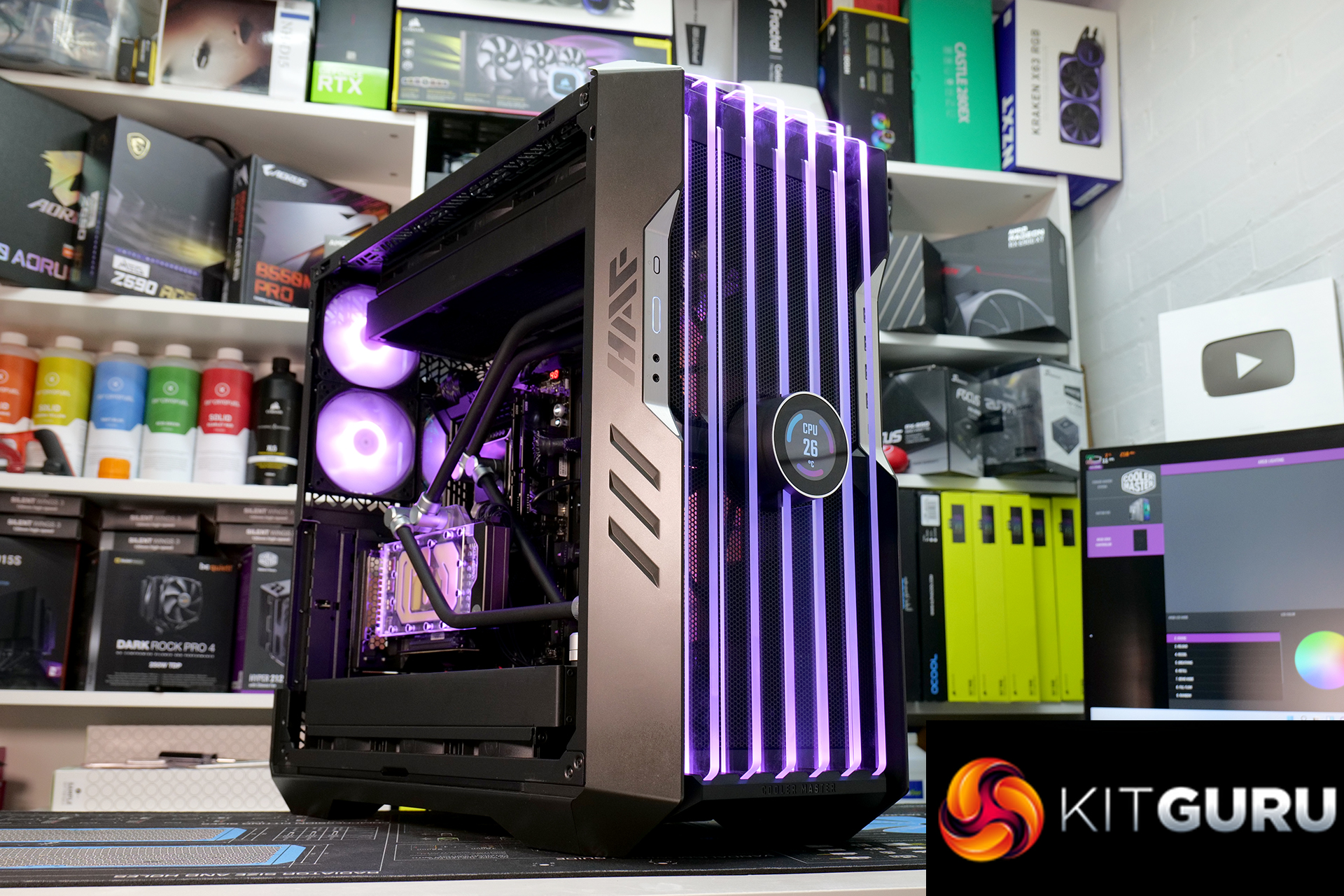 Overall though, it was a very pleasing experience installing a custom loop system inside this case. Our two 45mm-thick 420mm radiators were accommodated easily, along with the EK-Quantum Kinetic FLT 360 flat reservoir. The finished product looked great too, the EKWB RGB lighting could be easily hooked up to the chassis’ RGB controller and with minor tweaking in the Cooler Master MasterPlus+ software, the RGB synchronised perfectly.