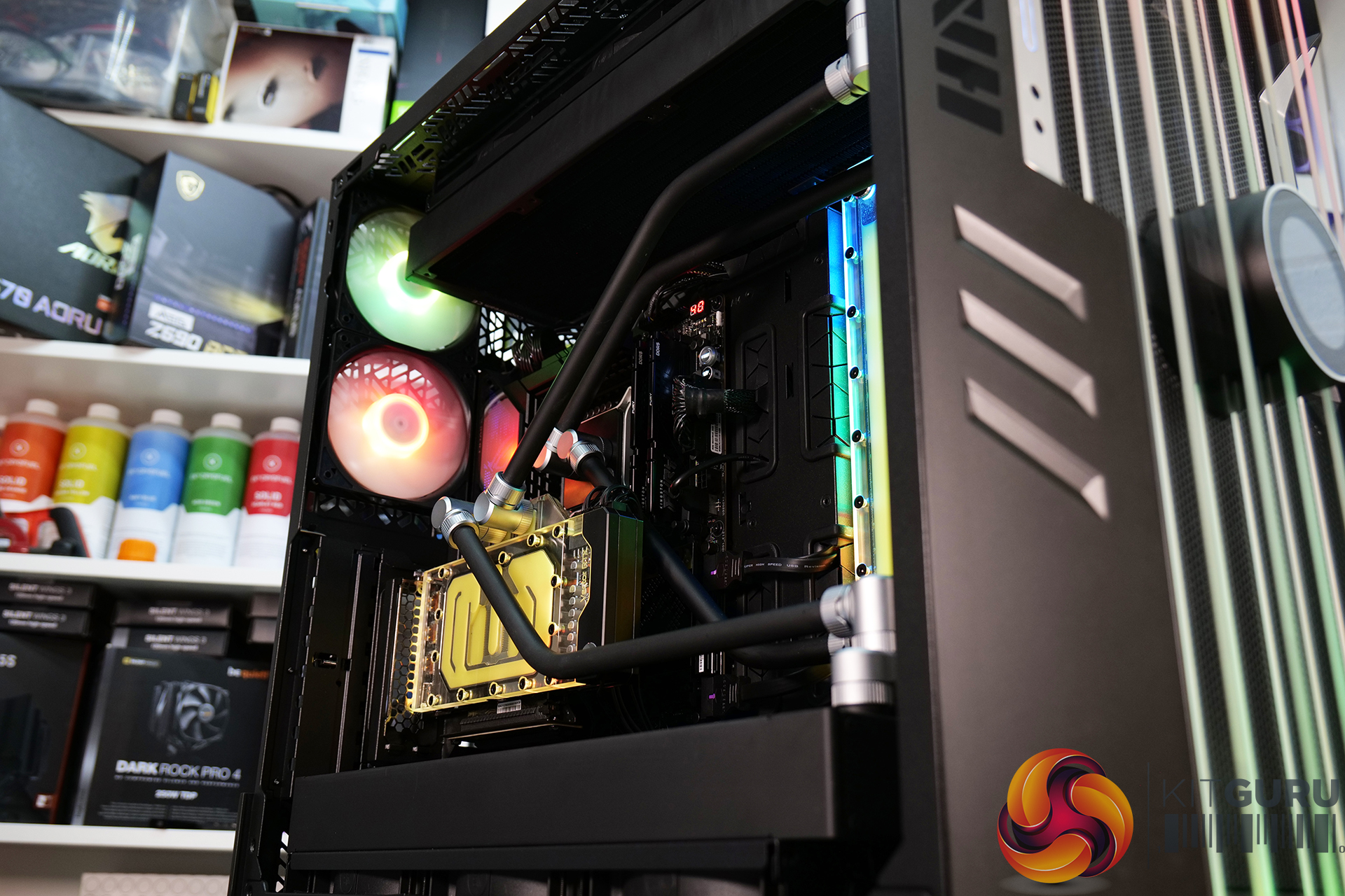 During the thermal tests, radiator fans were fixed to 850RPM and the front 200mm intake fans were fixed at 500RPM which meant that noise levels were on the low side. Removing panels only slightly increased noise levels but the system noise was still not distracting at all.