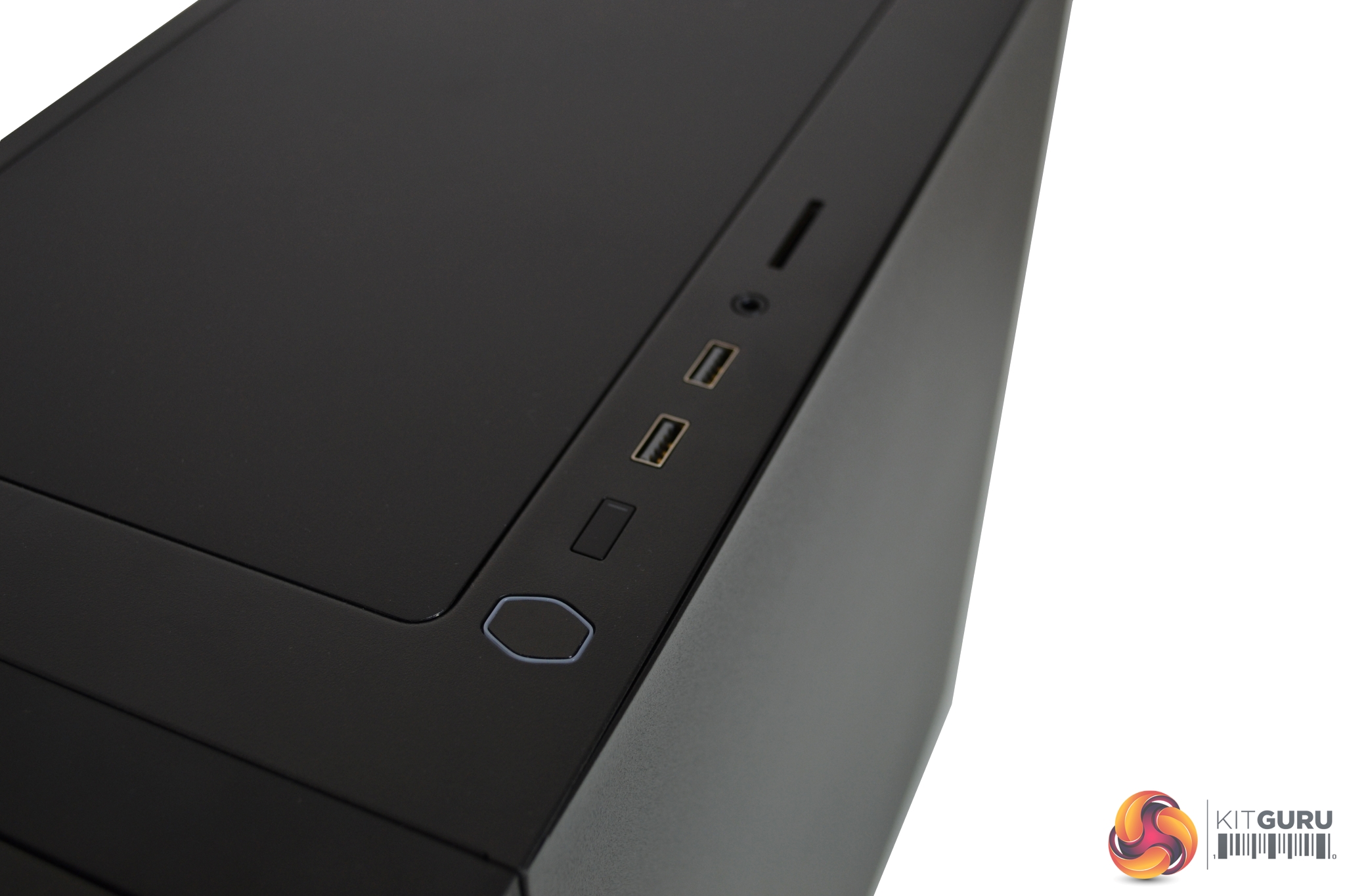 Along the top of the case is the I/O panel. The first things to note are the power button, in the shape of the Cooler Master logo, and ghd rectangular reset button. The power button is lit up with an LED, indicating power is on, and the reset button has a small LED, indicating storage activity. There are two USB 3 ports, a four-pole 3.5mm audio jack and SD card reader which is a handy addition.