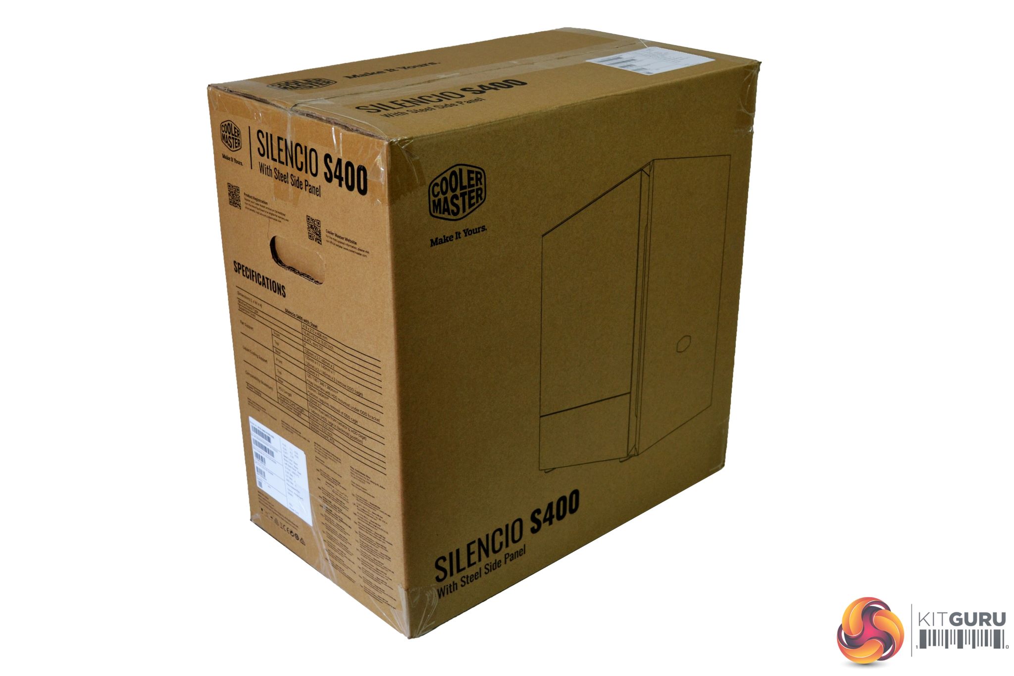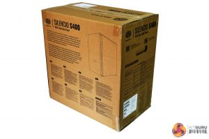 Cooler Master have packaged the Silencio S400 in a brown cardboard box. On the front, towards the right-hand side, there is a large image of the case with the Cooler Master logo in the top-left corner.
