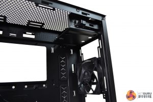 The top of the case is covered by a solid panel, to reduce noise, and this sits on top of the two 120mm/140mm fan mountings. This panel can be replaced with an included mesh filter, to use when installing fans or a radiator in the top section.