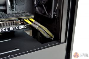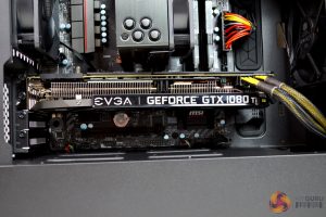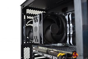 Installing a discrete GPU up to 319mm long should be manageable, as there is approximately 75mm of clearance between the motherboard and front fan. Our EVGA 1080 TI SC Black Edition fitted nicely, although it may have been a little close if a front mounted radiator was installed.