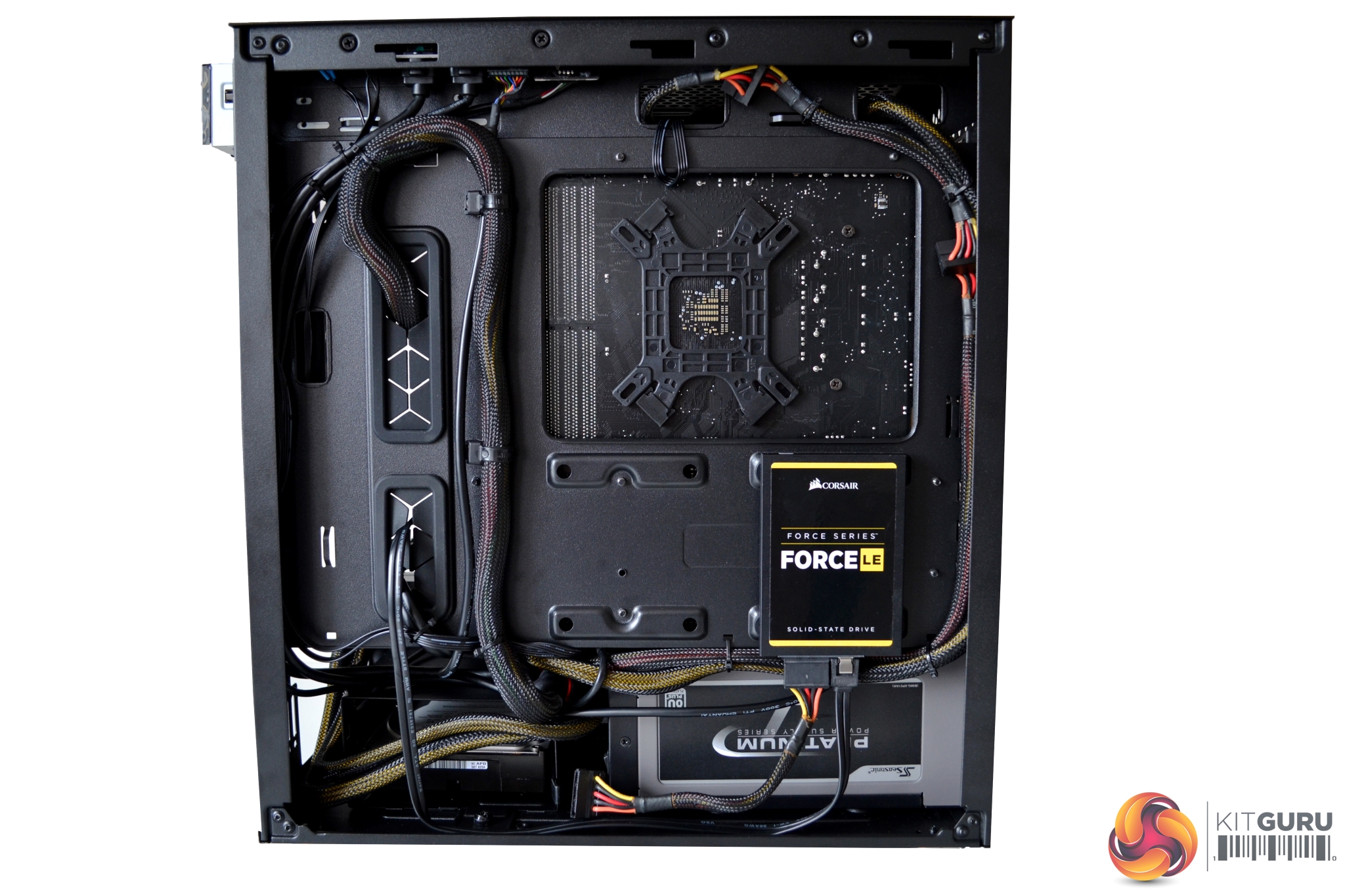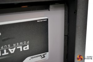 The Seasonic Platinum PSU we chose to use in this build may not have been the best. It was a very tight fit, as there was limited clearance to the 3.5” HDD cage, even with the cage in its furthest forward position. However, it did fit with some manipulation of the cables. There is always the option to remove the HDD cage completely to gain more space. Four rubber feet and a rubber seal pull sit tight to the PSU to help prevent vibration and unwanted noise.