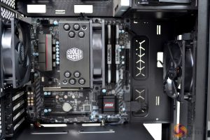 In the S400, there is clearance for up to a 167mm (with steel side) and 166mm (with tempered glass) CPU air cooler. For this build, we had no issues getting our Cooler Master Hyper 212 Black Edition to fit into this space.