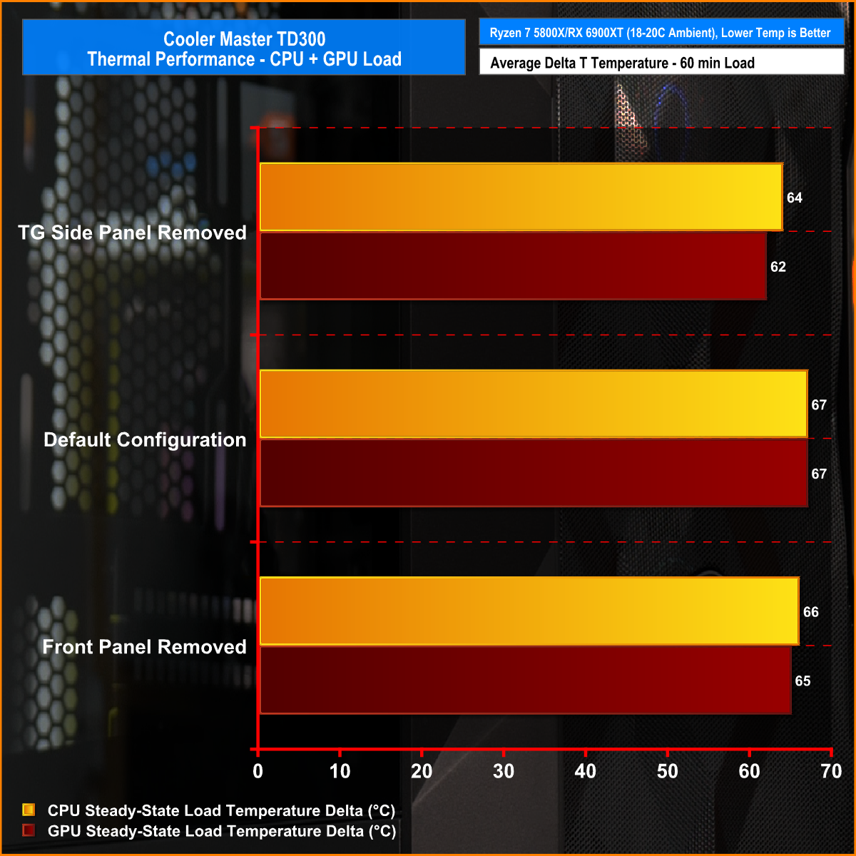 Since both the AMD Ryzen 7 5800X and Radeon RX 6900XT are difficult to cool so during our thermal tests the fans ramped up from their 800RPM base speed which increased noise output over the duration of the test. The Cooler Master TD300 has no sound dampening features so the case didn’t do a great job of hiding noise but the noise wasn’t too distracting.
