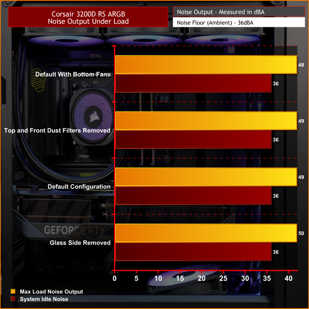 Moving on to noise output, results are again consistent across the different configurations. In the default setup the system measures 49 dBA under full load, while idle noise sits at a steady 36 dBA regardless of configuration.