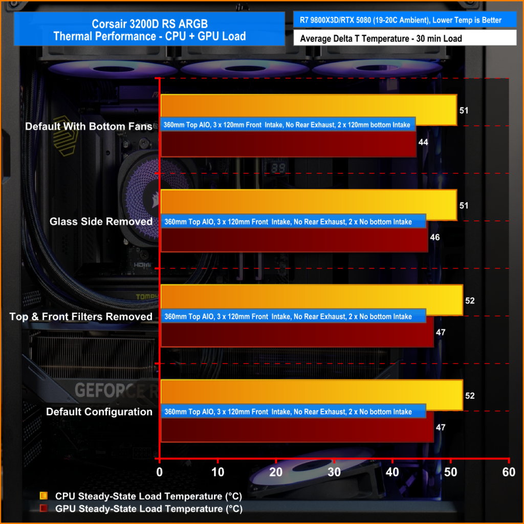 Looking at the thermal results, the 3200D performs consistently across all of our test configurations. With the case in its default setup, we saw CPU temperatures of 52°C and GPU temperatures of 47°C above ambient, which are solid out of the box results.