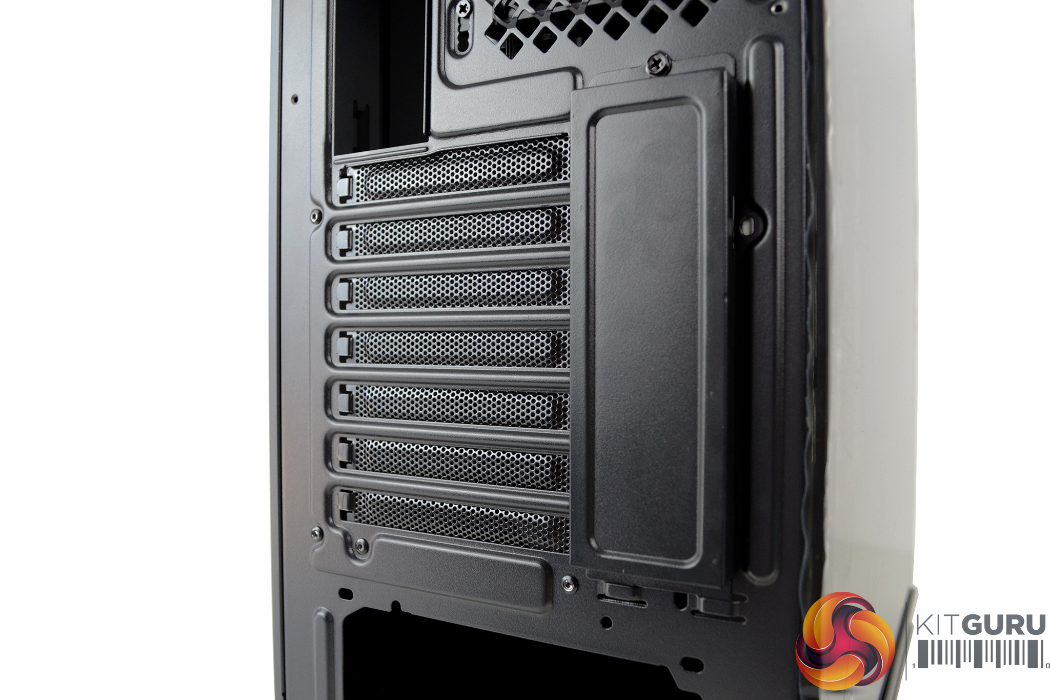 Below the PCIe slots is the usual power supply cut out (PSU is installed from the side) and above is the typical motherboard rear I/O cut out as well as a 120mm fan mounting with height adjustment. The case comes with a 120mm system fan pre-installed.