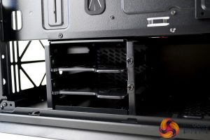 Mounted inside the PSU shroud is a 3.5-inch drive cage with two removable trays that drives are installed on outside the case. The Whole HDD cage features position adjustment by loosening off four screws on the underside of the case floor and sliding left or right.