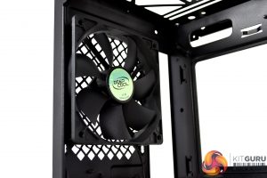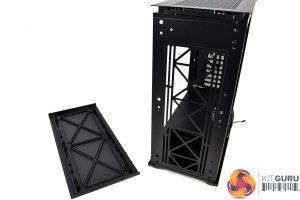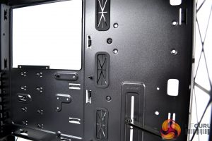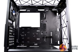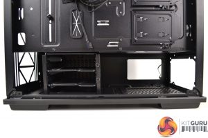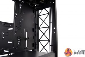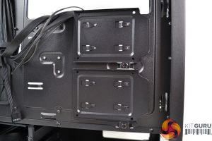 To the right of the motherboard tray and towards the front of the case are three cable management cut-outs with rubber grommets. Additional cut-outs above and below the motherboard tray are present, however, these are not protected with rubber grommets, which is a little disappointing.