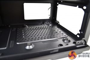 Removing the top panel takes almost as much force as the front, Beneath the top panel is another area for installing fans, there is space in the roof of the case for up to three 120mm or two 140mm fans. With the top panel removed you can see the perforated metal mesh dust filter that looks like it can be detached for cleaning by removing a few screws.