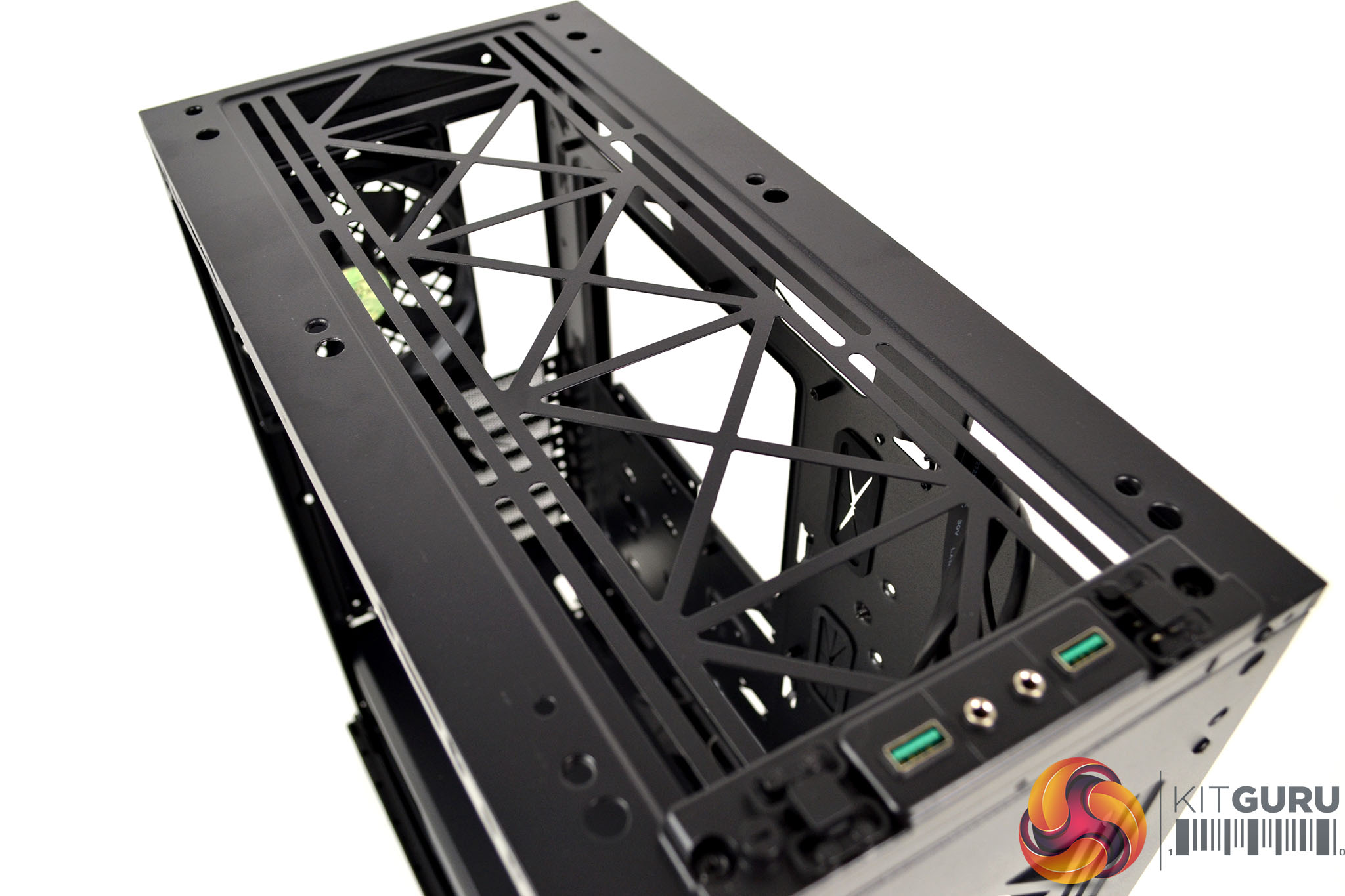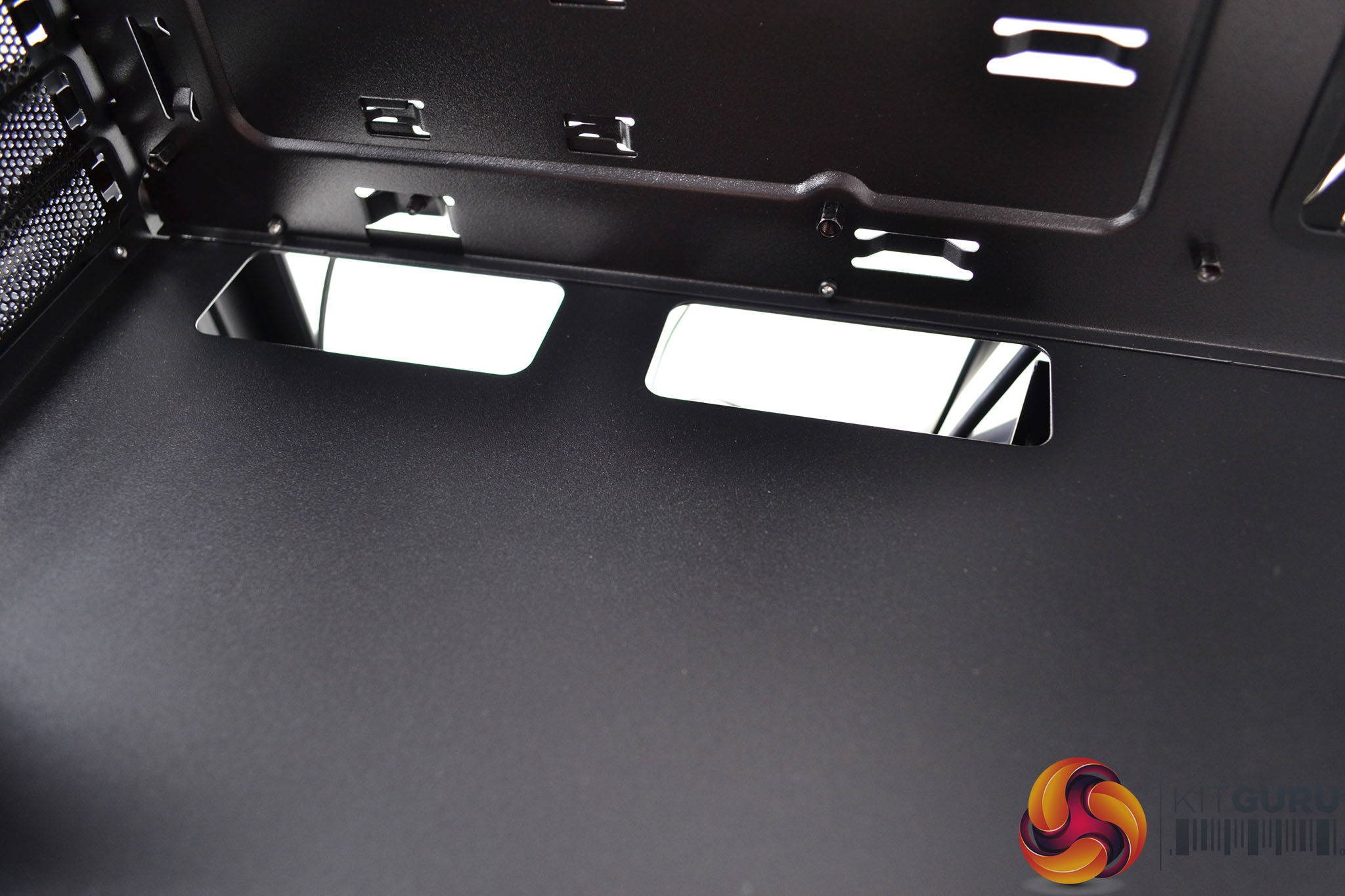 Removing the top panel takes almost as much force as the front, Beneath the top panel is another area for installing fans, there is space in the roof of the case for up to three 120mm or two 140mm fans. With the top panel removed you can see the perforated metal mesh dust filter that looks like it can be detached for cleaning by removing a few screws.