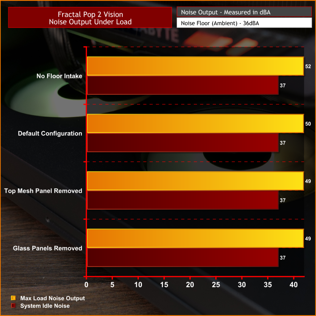 Removing the glass panels or the top mesh panel drops load noise slightly to 49 dBA due to cooler temperatures and slightly lower fan speed. Disabling the floor intake fans pushes noise up to 52 dBA, likely due to the fans working a bit harder to compensate. At idle though it’s consistent across the board at 37 dBA.