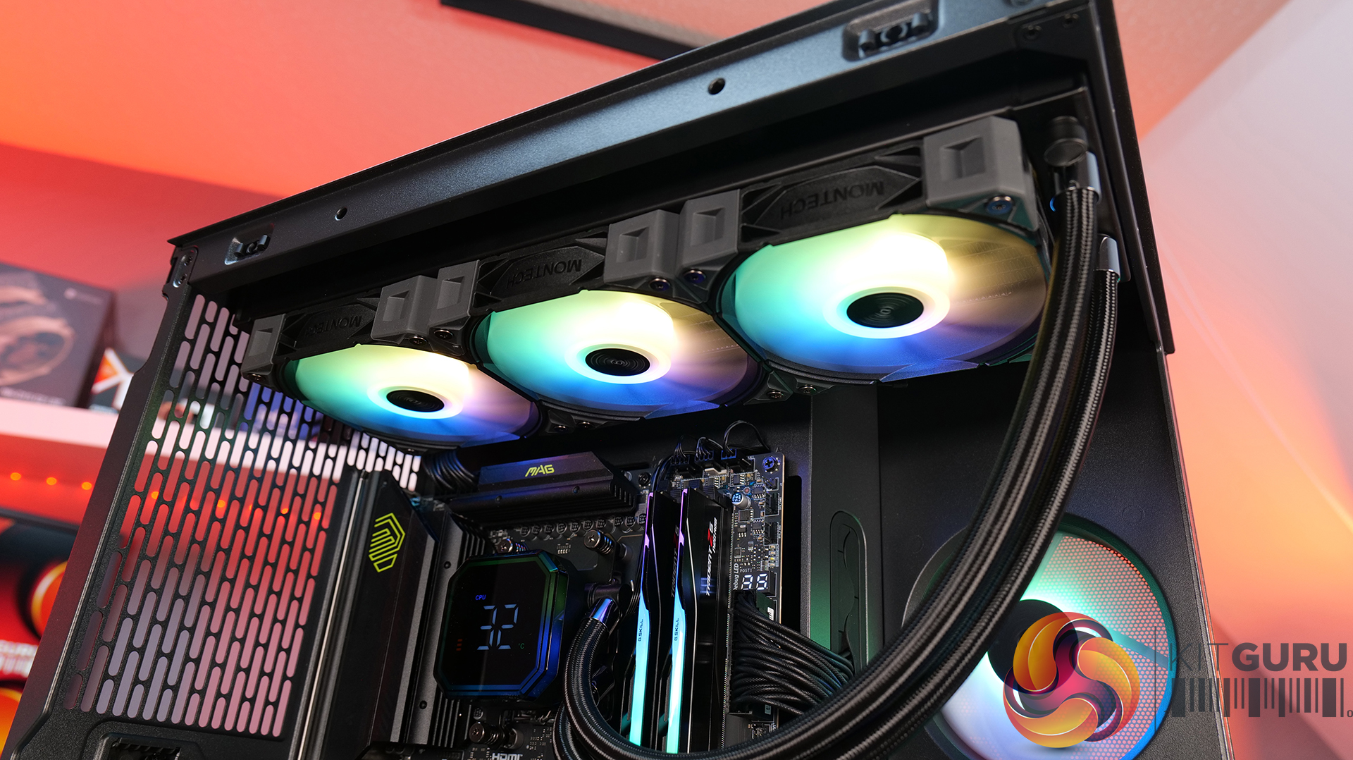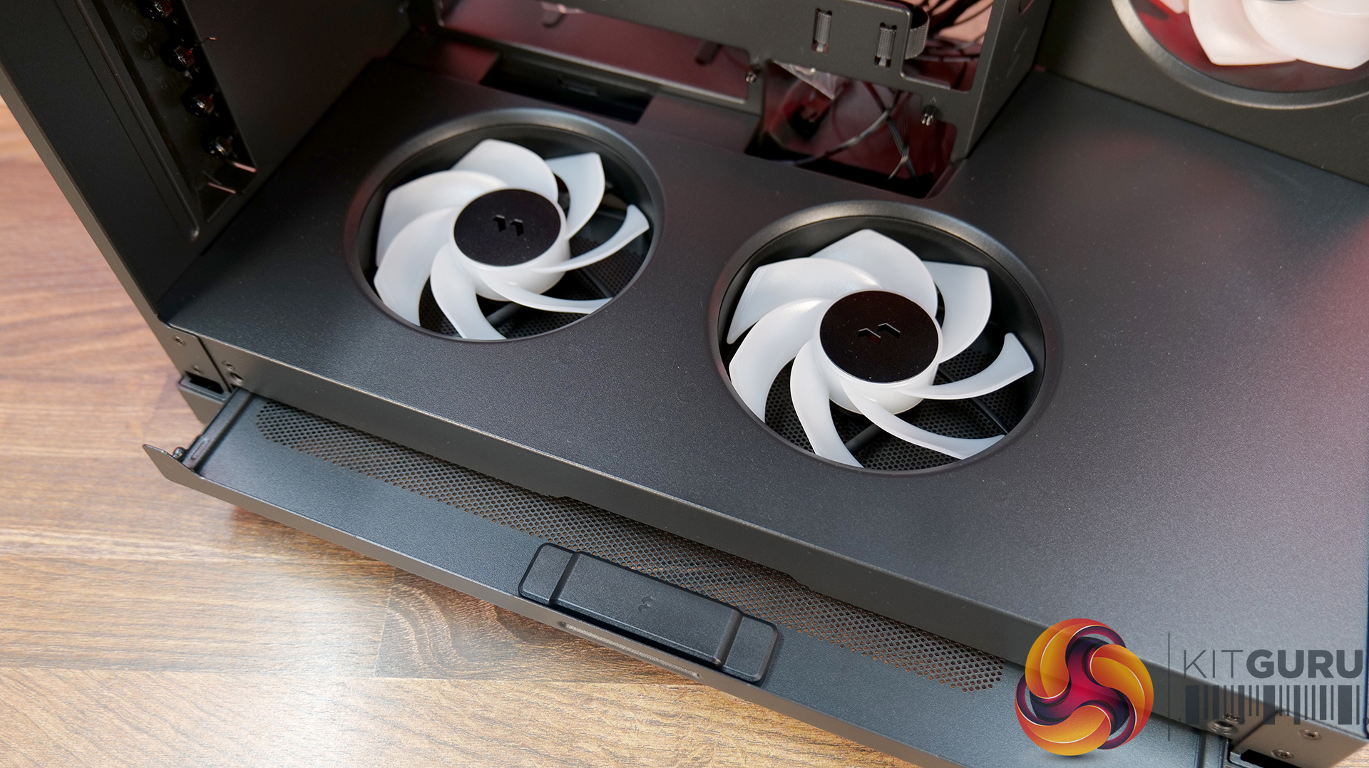 We test case thermals using a 360mm AIO as exhaust at the top and with the case in several different fan configurations. The default configuration shown in the charts is with the top 360mm AIO cooler, 2 x 120mm side and bottom intake fans and with all case panels installed.