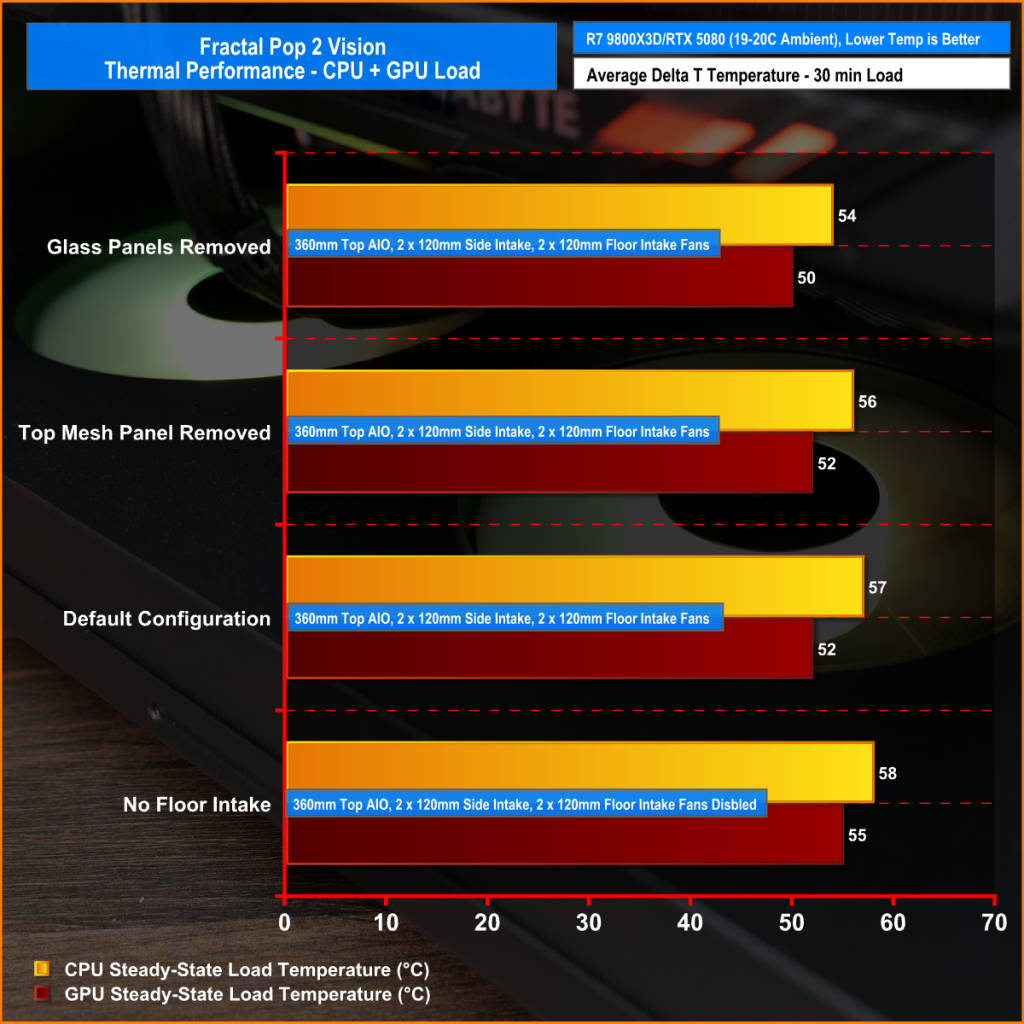 Looking at the thermals first, the Fractal Pop 2 Vision shows solid performance overall, with a few minor differences between configurations. With all glass panels removed, the CPU temperature is 54°C above ambient, and the GPU is at 50°C. With the case in the default configuration, temperatures rise slightly to 57°C over ambient on the CPU and 52°C on the GPU, so out-of-the-box airflow is clearly doing a decent job.