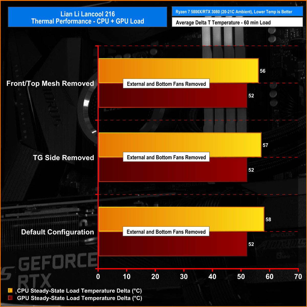When reading the review guide that came with the Lian Li Lancool 216, I was a little dubious of the claims made about one or two of the new features that had been implemented into the chassis. I wasn’t expecting the external rear fan to help much at all with GPU temperature reduction but I was wrong. The external fan combined with the bottom PSU shroud-mounted fans worked extremely well in our thermal testing by knocking a whopping 8°C off the GPU temperature.