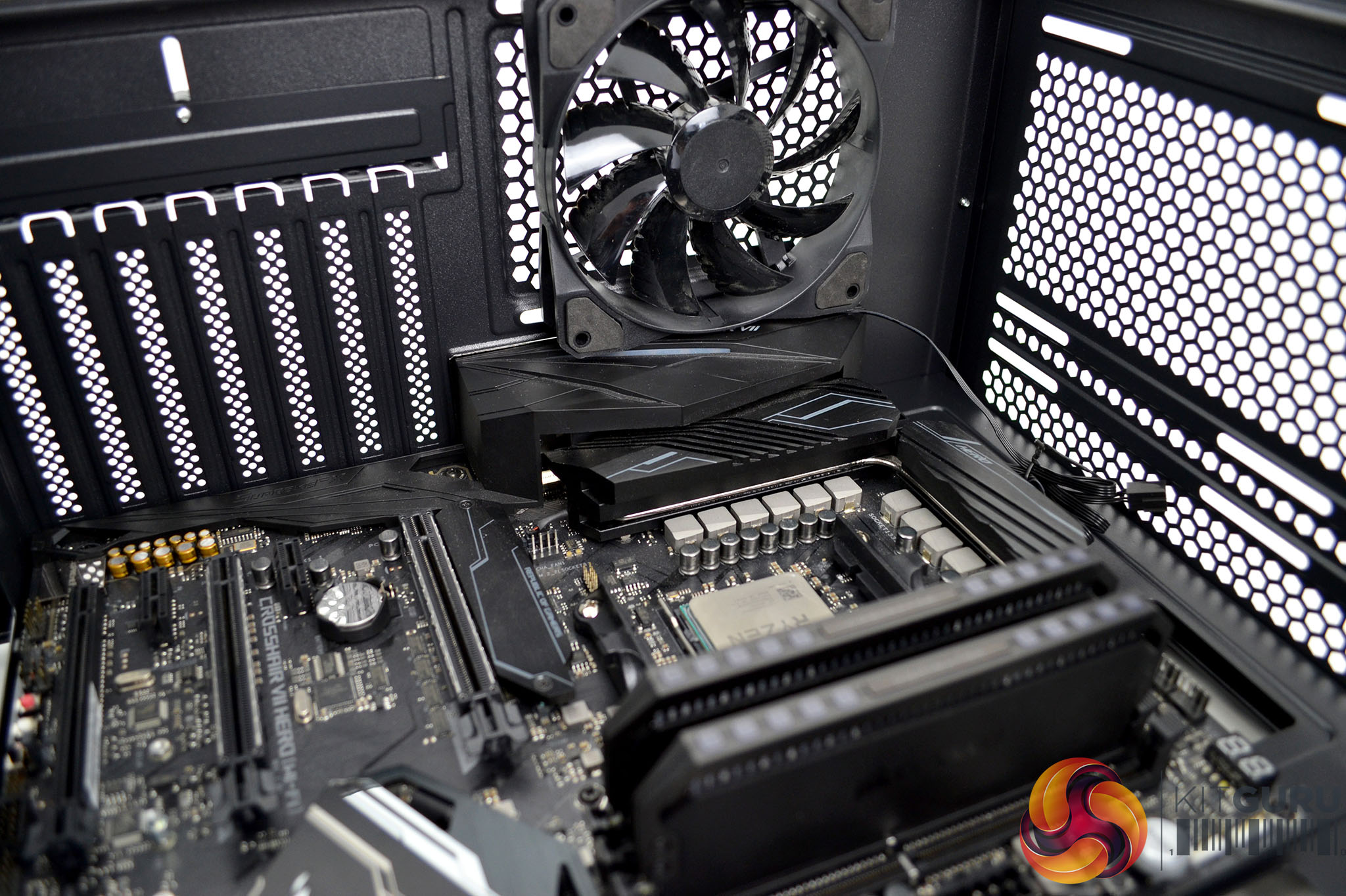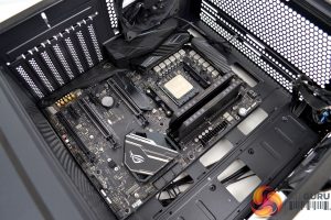Due to the generous amount of free space at the front of the case, installing a standard size ATX motherboard is a breeze in the 100R. There is plenty of room to manoeuvre the motherboard into position, even with our ROG Crosshair VII and its I/O shroud, there is just enough clearance to the rear-mounted exhaust fan.