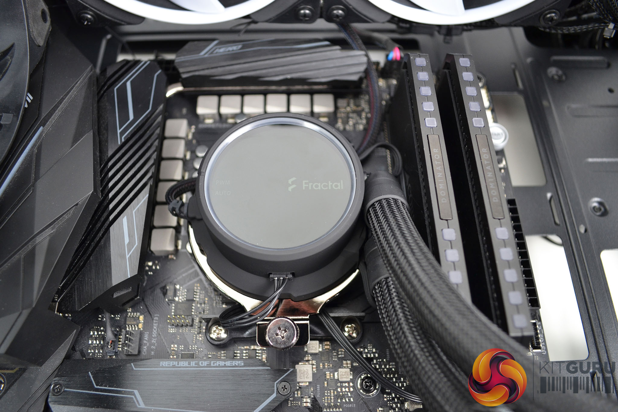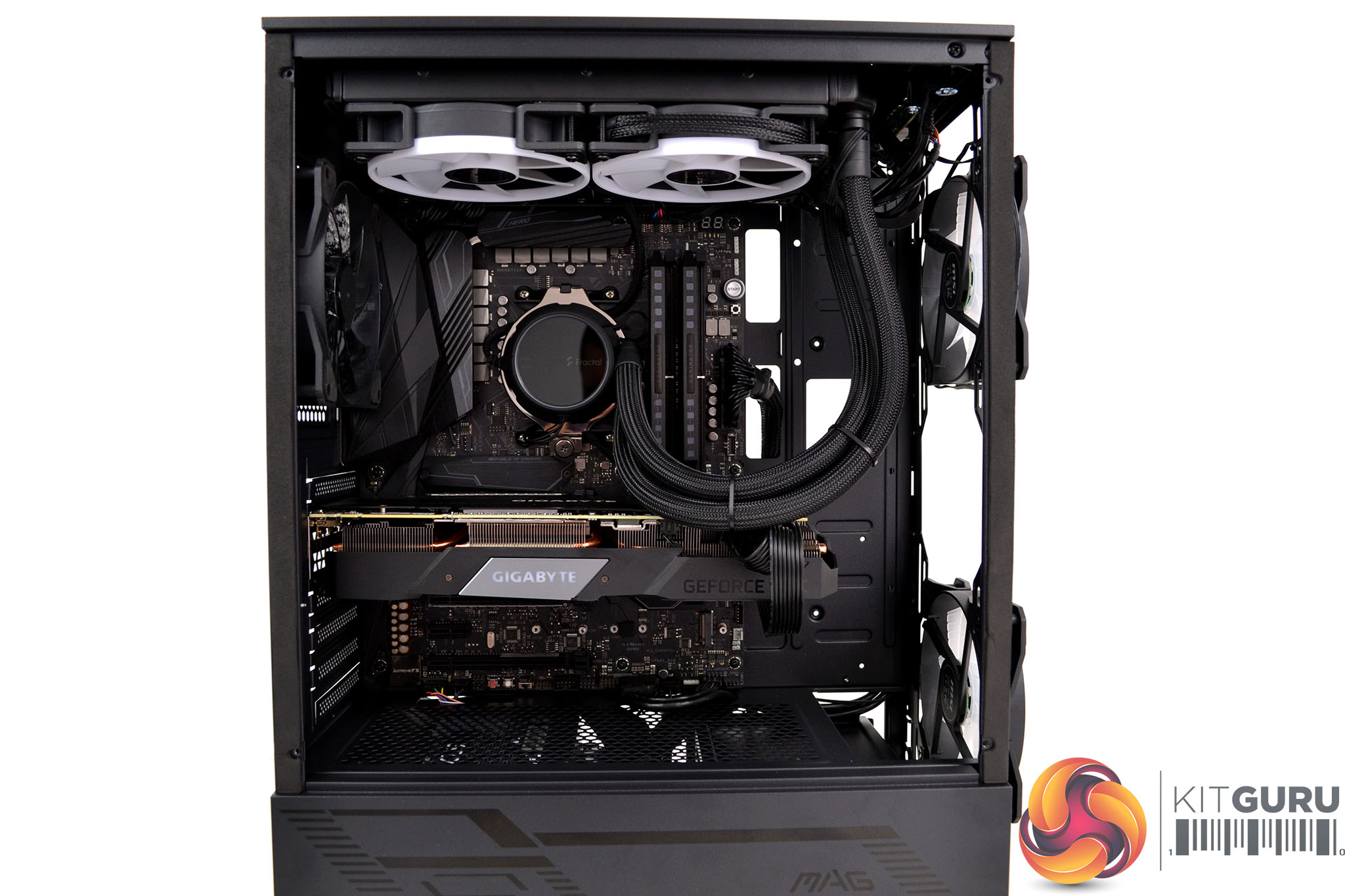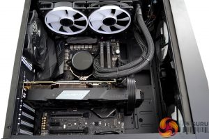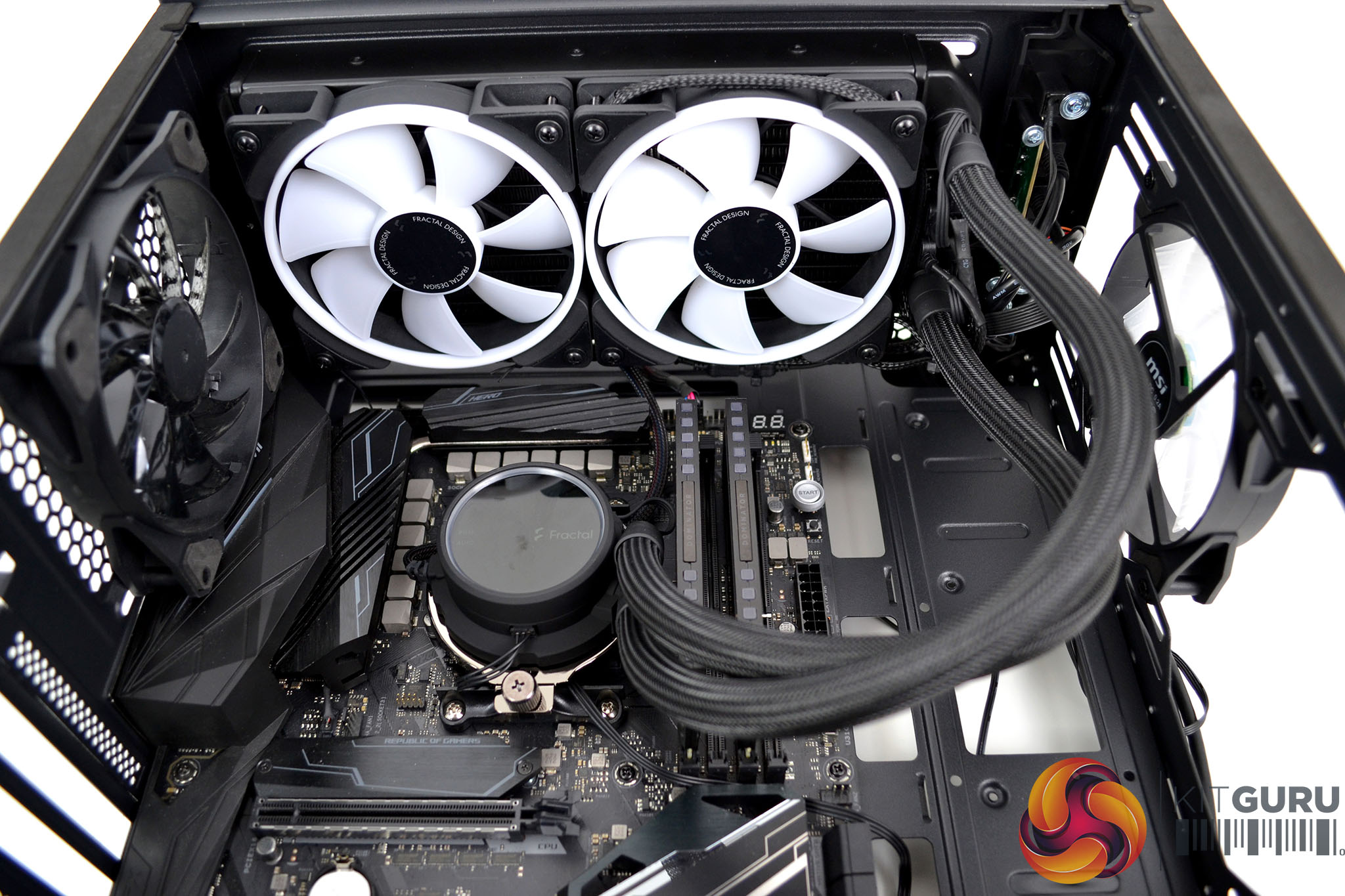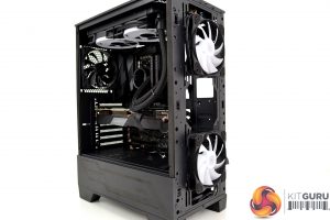 Installation of the Fractal Design Celsius+ S24 240mm AIO wasn’t too difficult either, again the space at the front of the case helps and MSI has placed the top radiator mounting more towards the tempered glass side panel, which again makes the installation of the AIO and surrounding power cables more accessible.