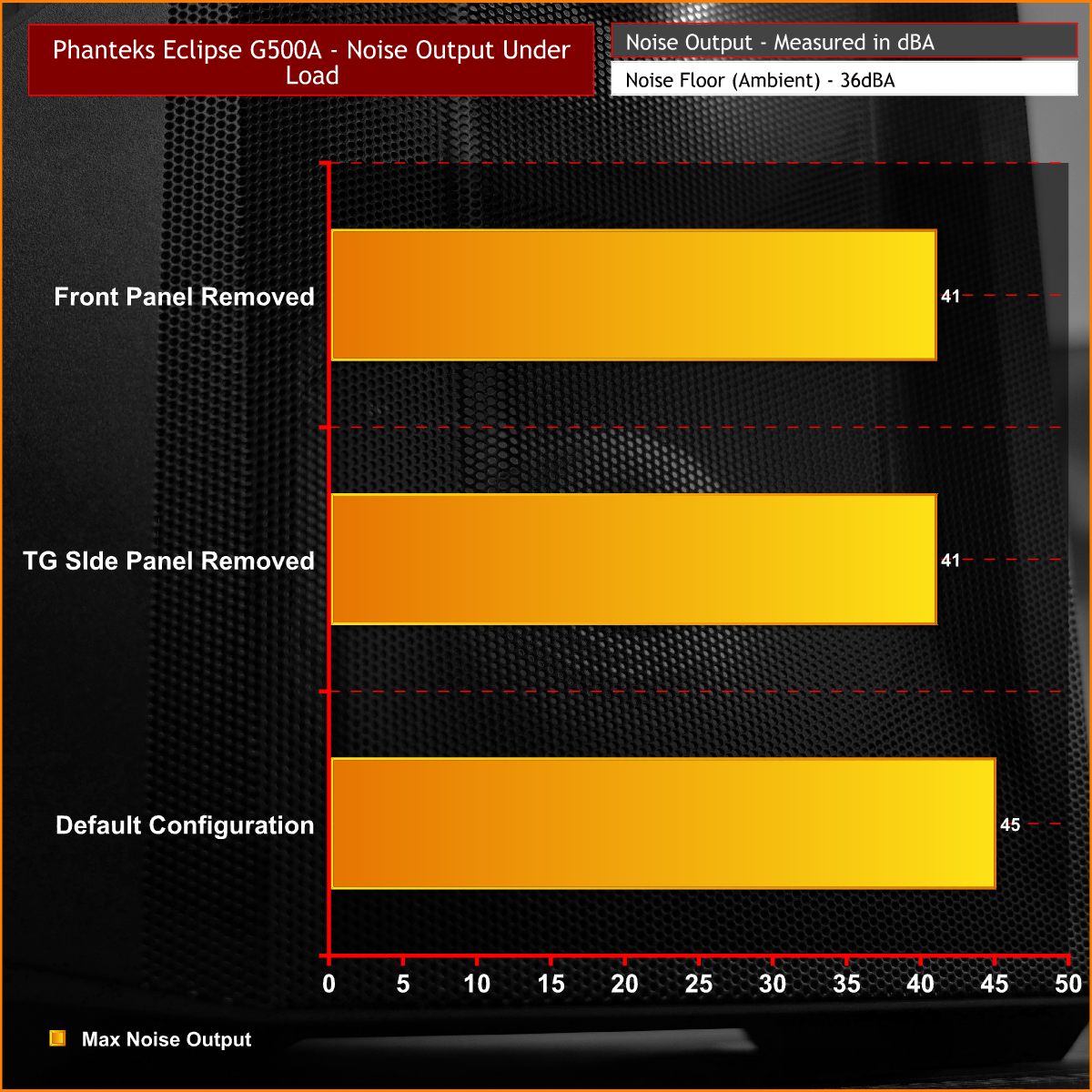 With panels removed, the CPU and GPU temperatures are reduced which also means that fan speed is lower. Therefore noise output with the front mesh and the TG side panels removed is lower than in the default case configuration. However, in either configuration noise output is tolerable due to the high airflow and relatively cool component temperature.