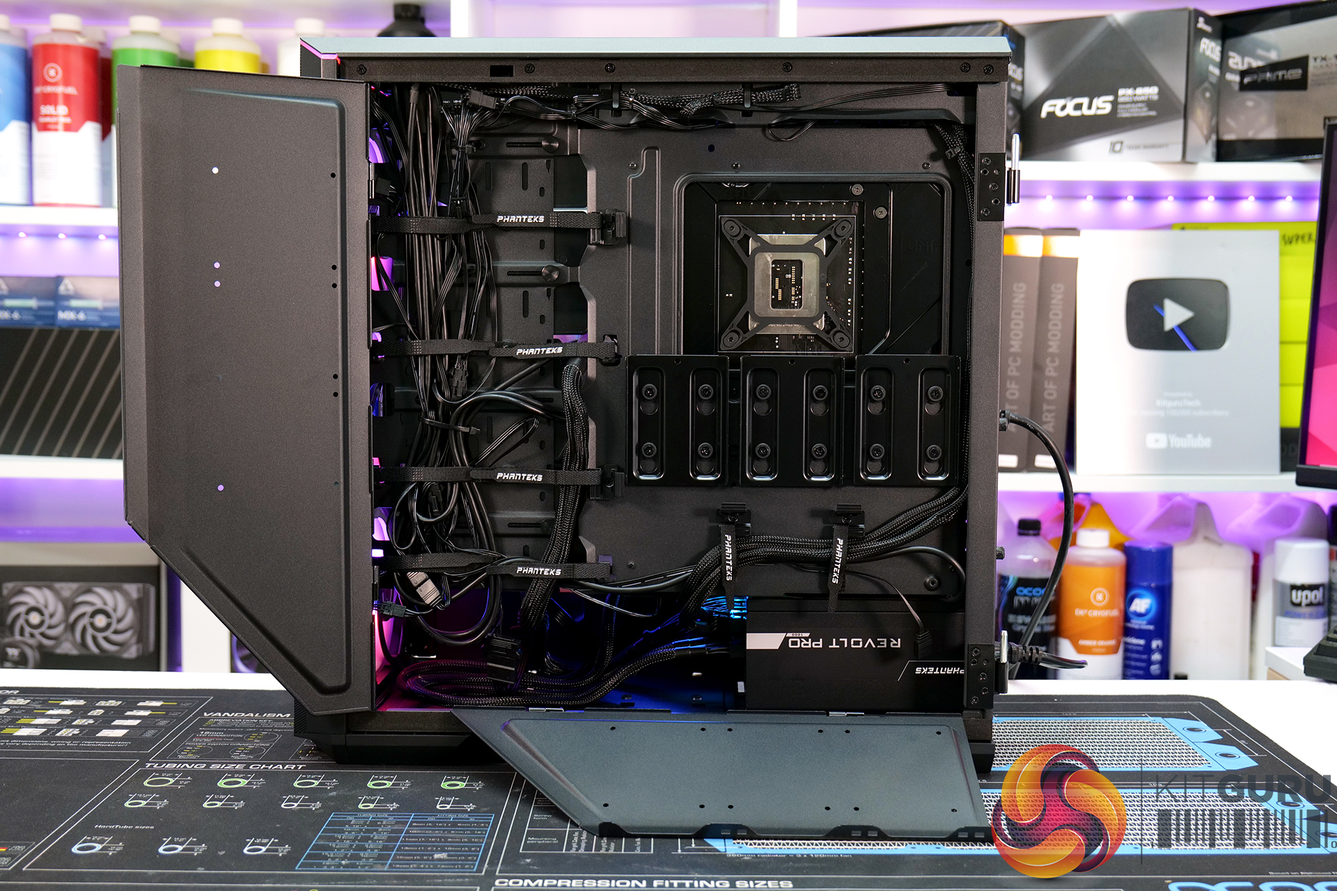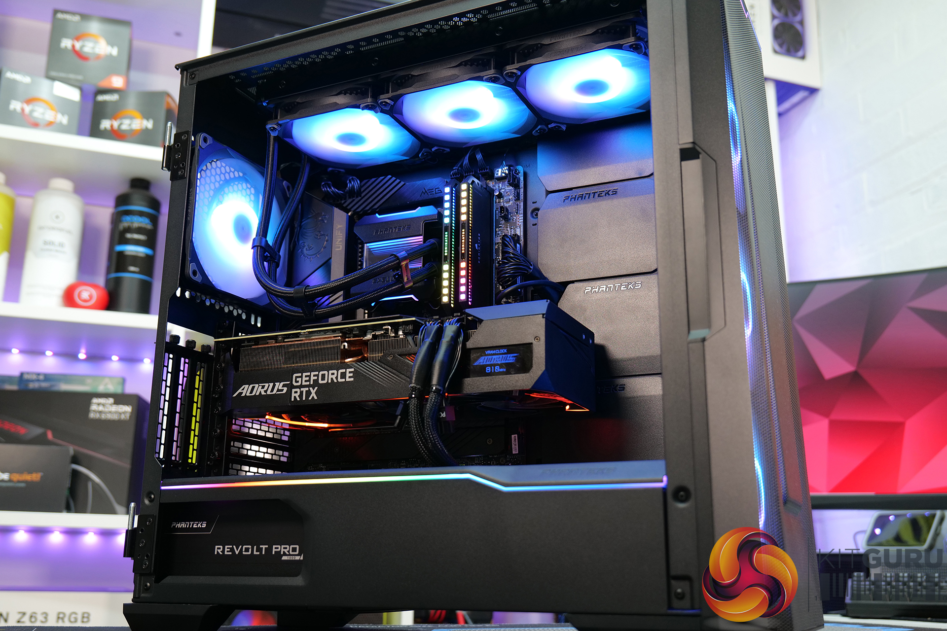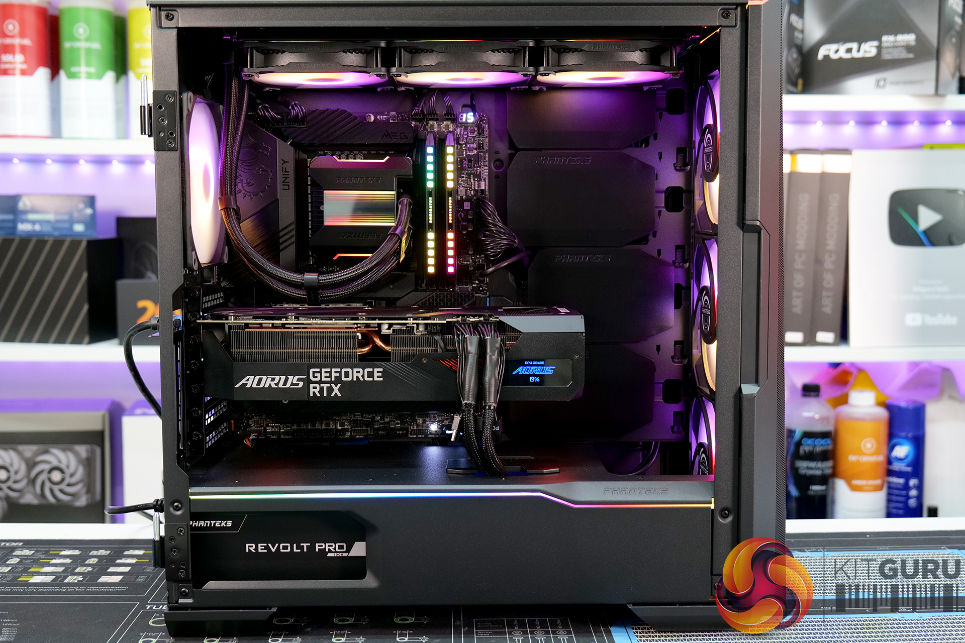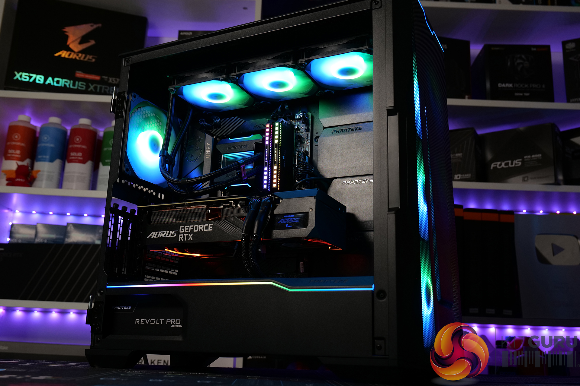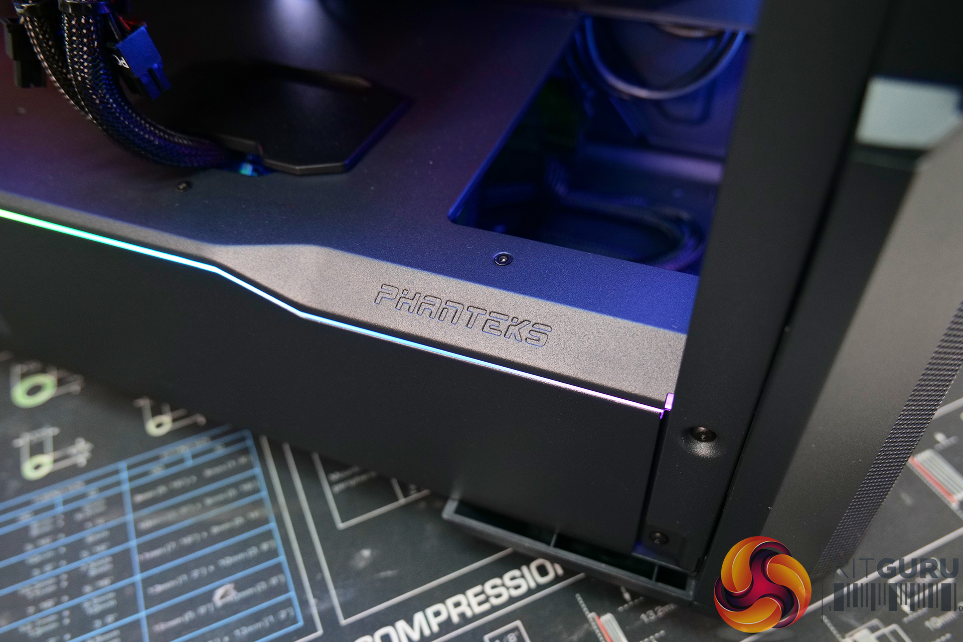 The built-in RGB lighting zones in the PSU shroud and at the top of the front panel are subtle but look great when illuminated. Phanteks does a brilliant job with the RGB lighting in most of its products. LEDs are well diffused, there are no noticeable LED hot spots and the colours are very vibrant. RGB lighting can be controlled easily via the top panel buttons or integrated with motherboards via a simple 3-pin 5v connection which is ideal.