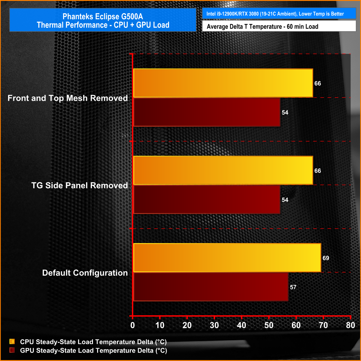 With the case in its default configuration, both the CPU and GPU temperatures were perfectly acceptable for a high airflow mesh front case. However, removing the mesh front and the tempered glass side panels reduced both the CPU and GPU temperatures, showing that the mesh front panel still produces some restriction in airflow, but works well overall.