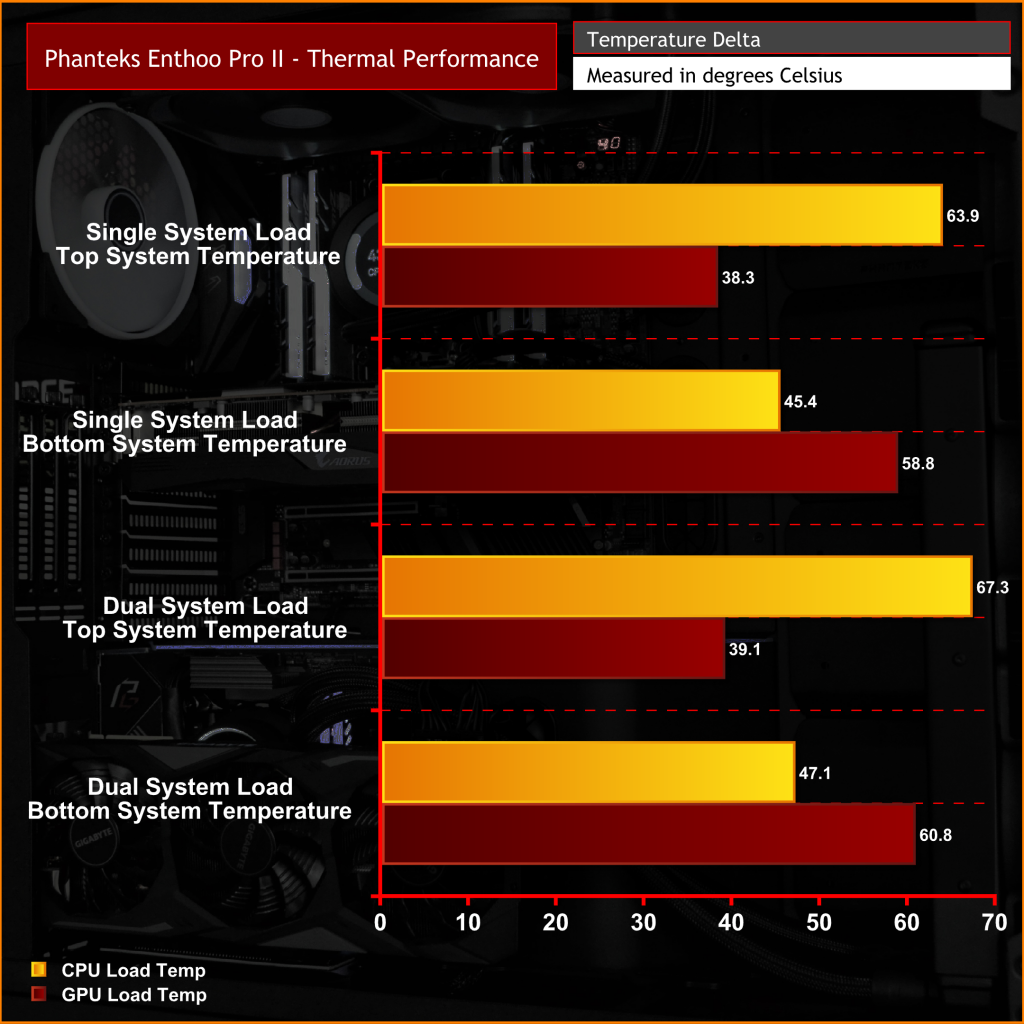 Overall, the thermal performance of the Phanteks Enthoo Pro II is impressive. A combination of high airflow due to the mesh front panel and support for multiple radiators means that even when both systems are under load, there is no sign of the CPU or GPU in both systems getting too hot, and there was only a slight increase of CPU temperature in both systems.