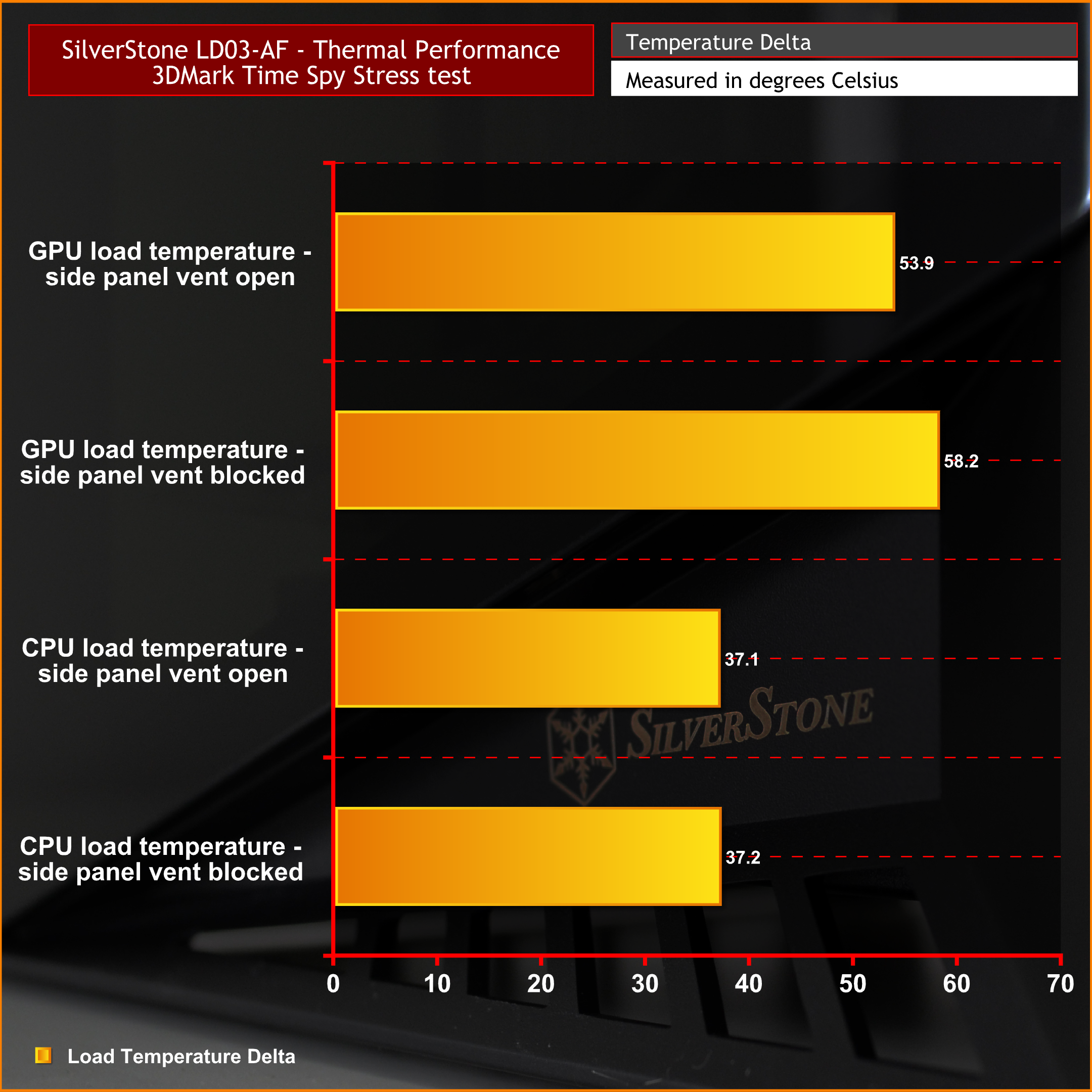 It is pretty clear to see from the chart that the new side panel designed for improved airflow to the GPU is doing its job, with approximately 5ºC lower GPU temperature recorded during our test. Throughout the test, CPU temperature was unaffected with the side panel vent open or blocked. However, the CPU wasn't under huge load and the test was aimed at investigating whether the new GPU airflow panel works as expected and it does.