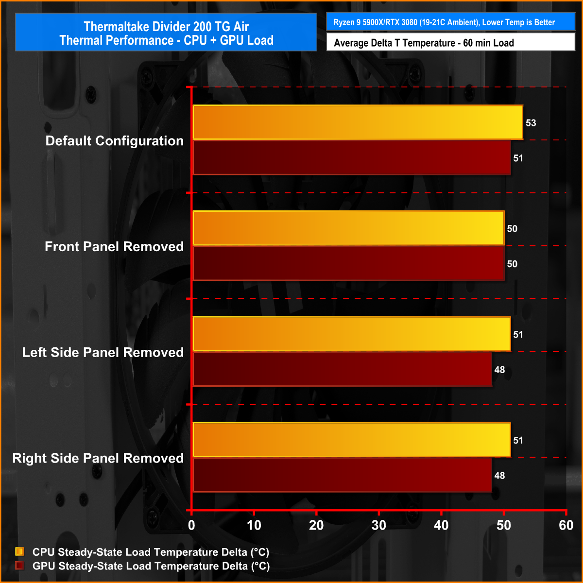Thermal performance is measured with the case in various configurations, such as the default, with the tempered glass left-hand side panel removed and with the front panel removed to see how these configurations affect the CPU and GPU temperature. During testing, only stock case fans are used unless otherwise specified. All water pumps are set to maximum RPM and fans are set to a fixed RPM by the Motherboard software/BIOS.