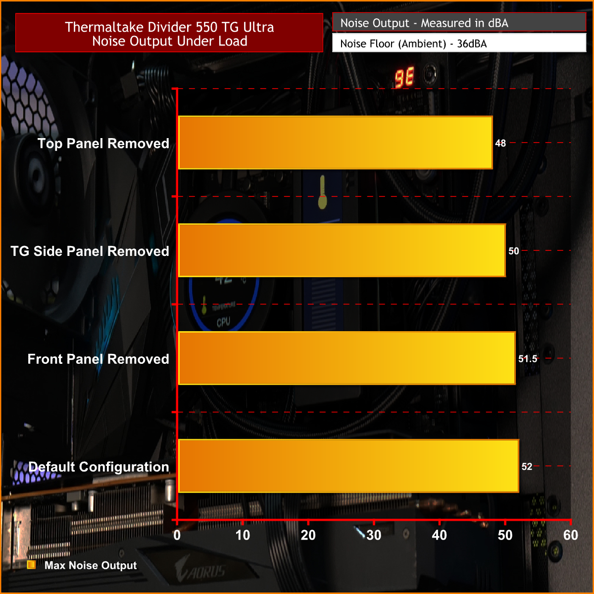 As we often see with closed front cases, the Thermaltake Divider 550 TG Ultra struggles to keep the component temperature under control while the system is under a heavy combined CPU and GPU load. During gaming scenarios, the system would be under less load so able to cope better, but its disappointing to see that in 2022 case manufacturers have not found a solution to this problem still.