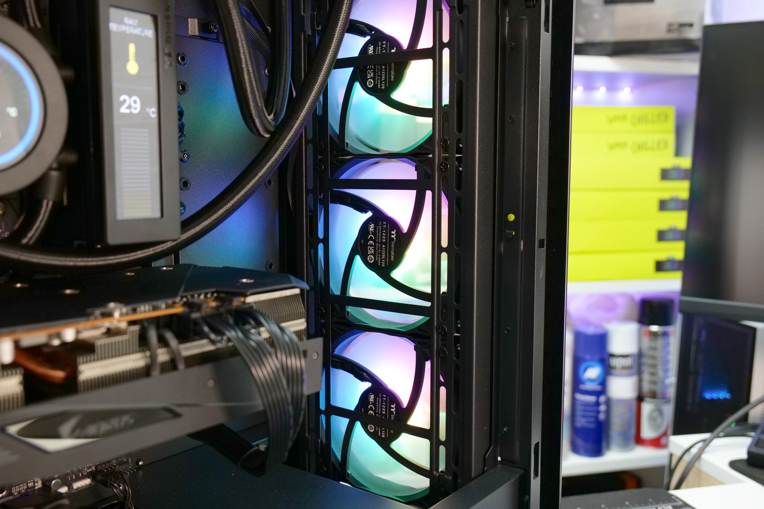 - Three 120mm 5V ARGB fans come pre-installed in the front of the chassis. RGB lighting can be controlled by re-purposing the reset button on the font I/O panel or alternatively via RGB control software from leading motherboard vendors.
