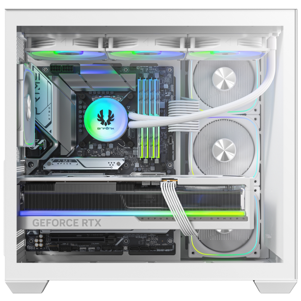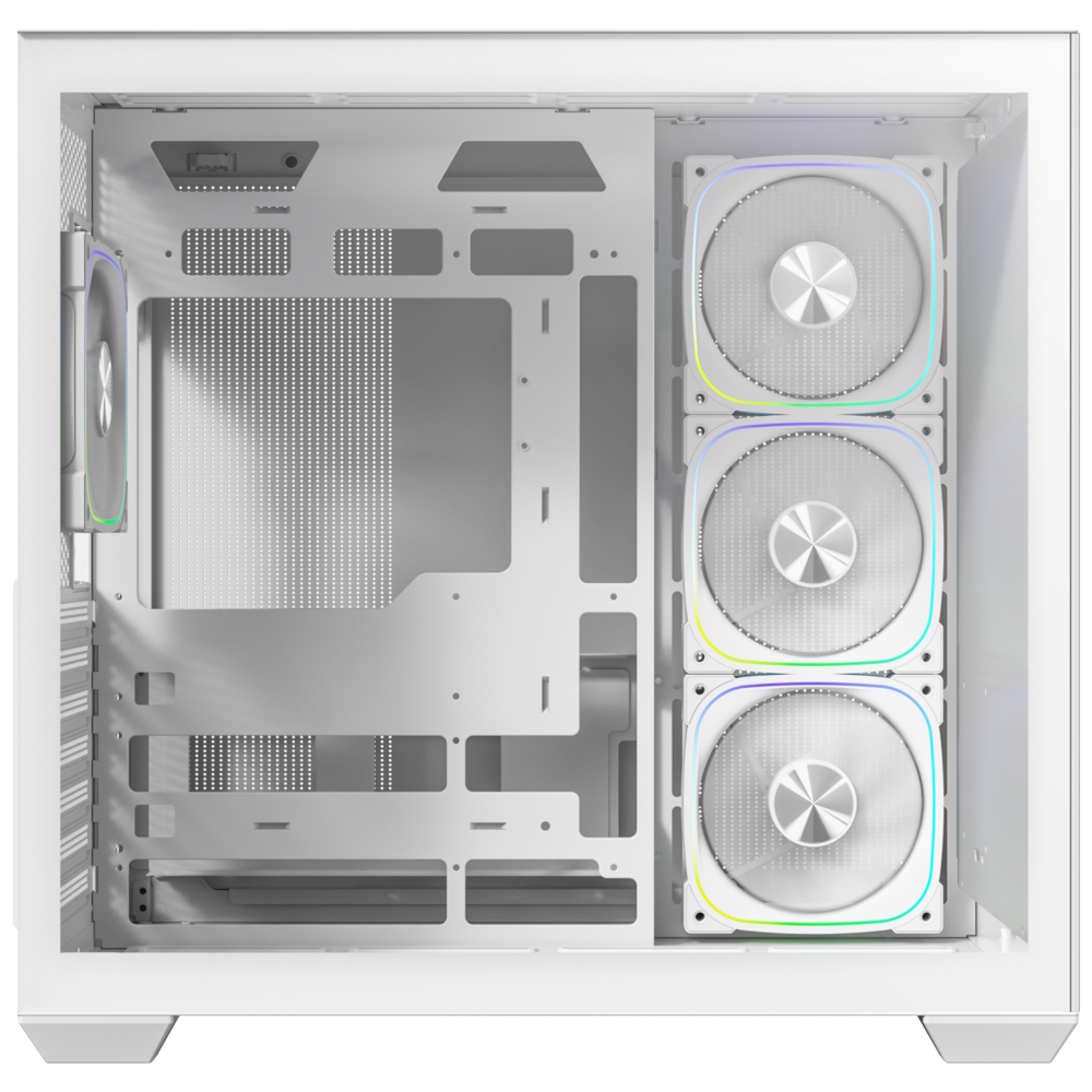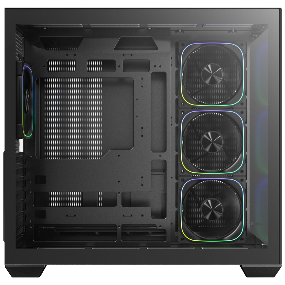 The case comes pre-equipped with a balanced fan configuration: three 120mm ARGB reverse-fans on the side/motherboard panel and one 120mm ARGB fan at the rear for exhaust. Additionally, the ALD supports up to 360mm radiators on both the top and motherboard panels simultaneously. Hardware clearances are equally generous, supporting graphics cards up to 400mm in length and CPU tower coolers up to 175mm in height.