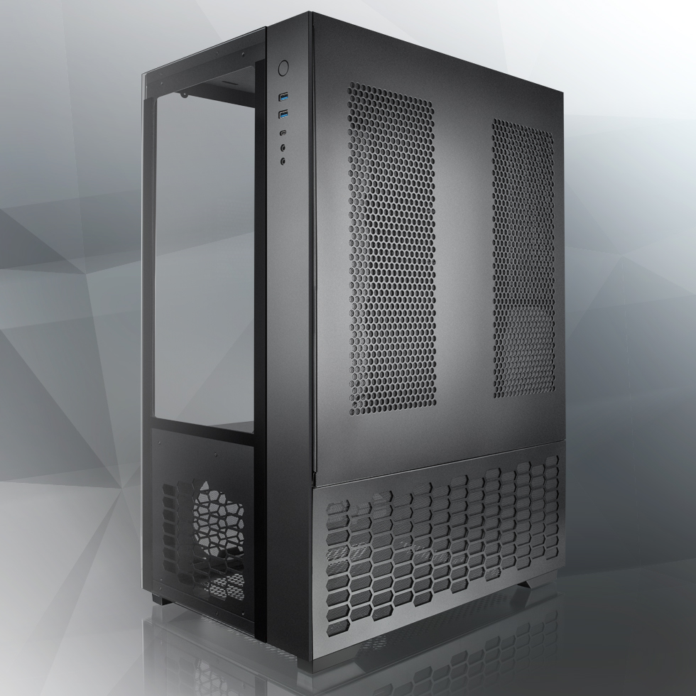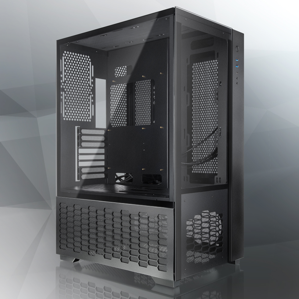 Raijintek Paean series of cases are known for their “strengthened structural design”. This case is made of 2mm aluminium and 0.8mm steel and features a front and side panel with 4mm tempered glass. Its interior is entirely coated in black and features large vents for increased airflow on the top and bottom of the case.