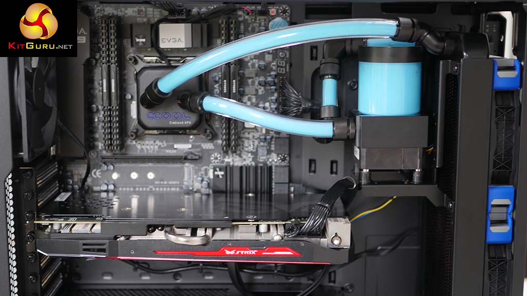 As we point out in our video this isn’t a recommended specification but more a way of showing what is possible. The CPU loop slipped into place without drama and the mighty Asus Strix R9 390 graphics card had loads of space. Admittedly we made life easier by using a Micro-ATX EVGA motherboard but we had no need for a full ATX motherboard so it seemed like a logical choice.