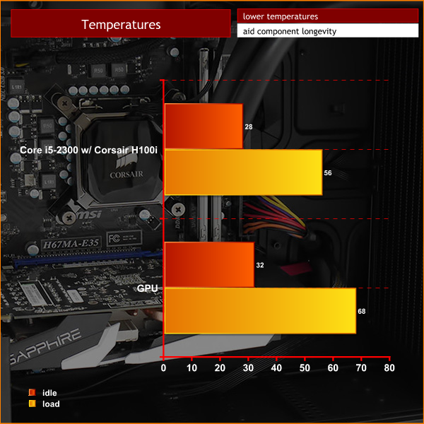 No problems with any of the temperatures. The Core i5 2300 idled at 28c, rising to 56c under load. The graphics card idled at 32c and rose to 68c under extended load.