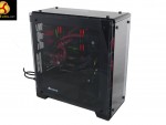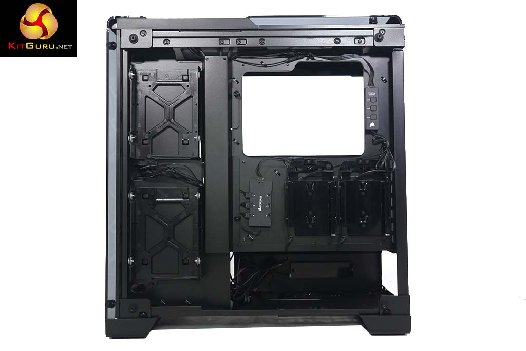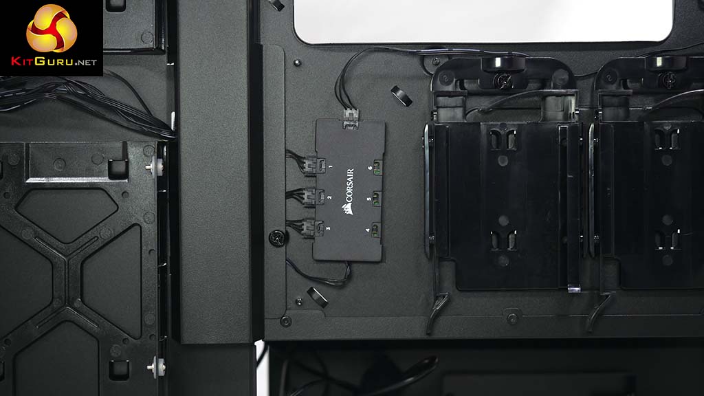 With the rear glass panel removed you can see the way Corsair has attached the SP120 light control unit on the back panel with a piece of adhesive tape and then connected it to the control buttons on top of the case next to the I/O panel.