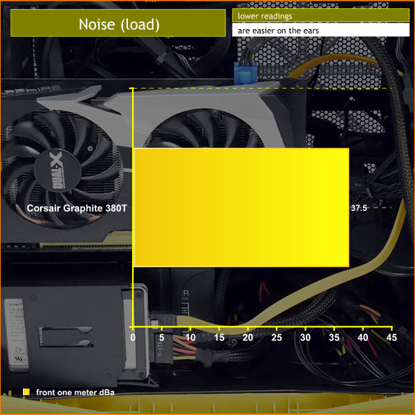The Corsair Graphite 380T is impressively quiet with the fan speed controller set to speed one and doesn't sound much louder on speeds two and three. We are talking fractions of a dBA, however the extra fan speed didn't make any difference as the components were already reasonably cool.