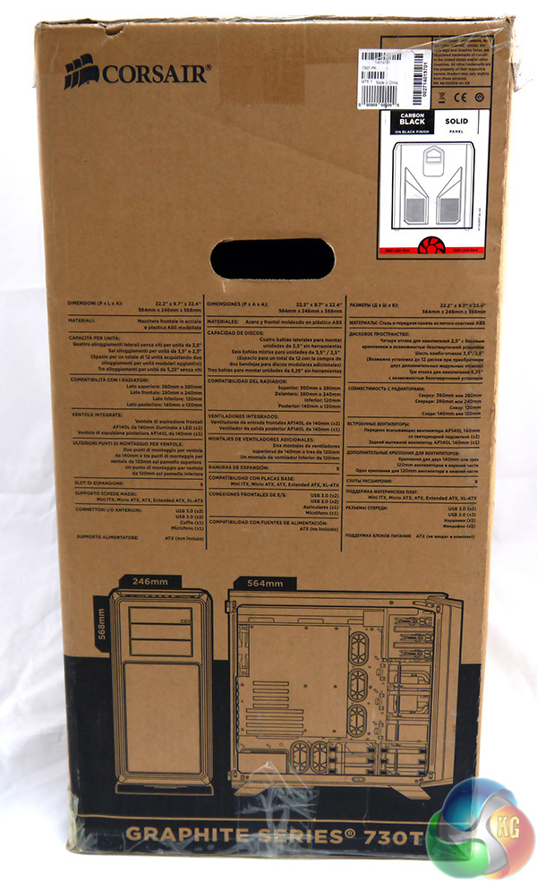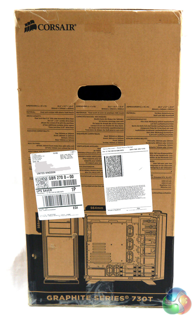 On one side of the box there is an exploded diagram that shows the main features of the 730T and it is evident that Corsair has taken care to illustrate the 730T rather than muddy the waters with a 730T/760T package.