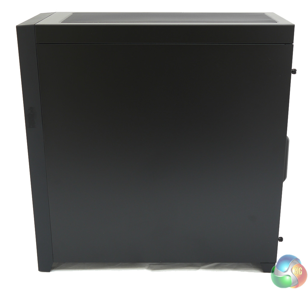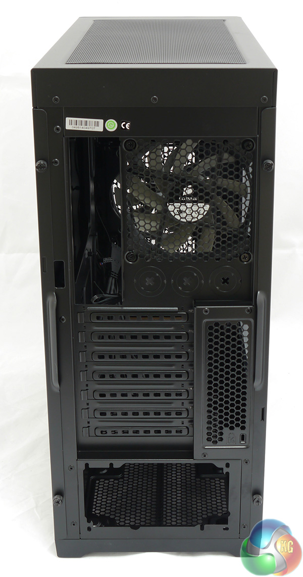 One side panel is plain steel, the other has a large window and at the back we find seven expansion slots and the power supply located at the bottom of the case. You'll also find a great deal of perforation and an ALF120L exhaust fan. The perforations are so extensive that it is quite easy to look straight through the case from front to rear.