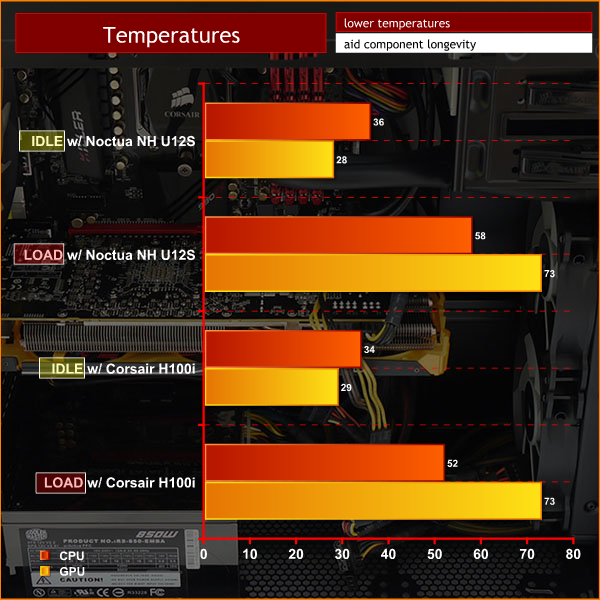 Swapping to the Corsair H100i liquid cooler helped improve CPU load temperatures, dropping to 52c. Well within safe parameters.