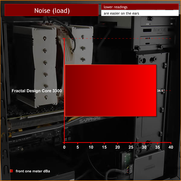 No doubt the reason for the decidedly average cooling is that the two 140mm case fans operate at a low speed and the result is that the heavily perforated Core 3300 is much quieter than we would have expected, despite the absence of any noise deadening material.