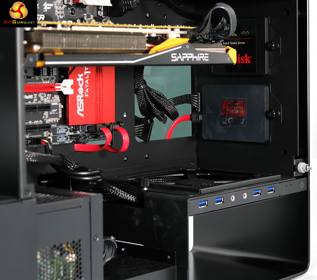 Perhaps the best way to consider the 904 Plus is by looking at the two Solid State mounts inside the front panel of the case. These caddies are retained with a single thumbscrew which means you have to install the SSD in a particular way to ensure you can connect the cables. This gives you a 50:50 chance the label on the SSD will be upside down, which is a minor quibble but a real surprise when you consider that 904 Plus is so clearly built to give a particular style and look. In that context the idea of an SSD that is mounted upside down is simply unacceptable.