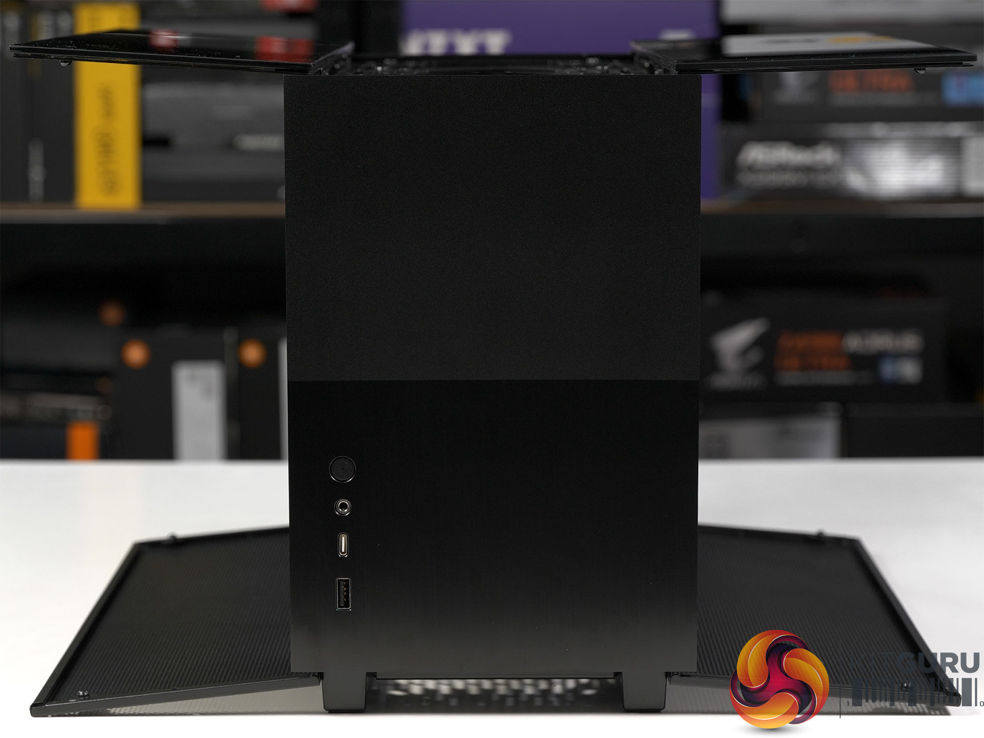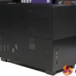 - The glass side panels are equipped with a curved slot hole at the rear to attach the panel to the main chassis with a thumbscrew that holds the glass in place even when the panel is opened. When the glass panel is installed at the bottom, the fixed thumbscrew prevents it from completely sitting on the table, avoiding any possible damage