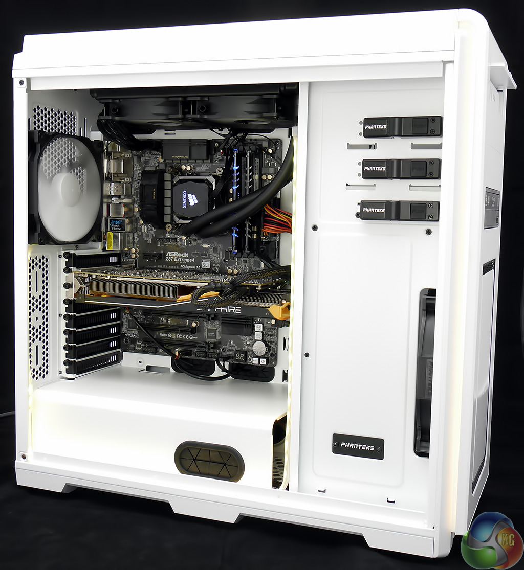 Installing an ASRock Core i7 motherboard in the Enthoo Luxe was a simple matter, however the same had also been true of the Enthoo Pro. It was during the installation of the Corsair H100i liquid cooling system that I came to appreciate the extra space in the roof of the case. The radiator vanishes out of sight with plenty of clearance above the top edge of the motherboard that allowed me to route the wiring pretty much wherever I wanted.