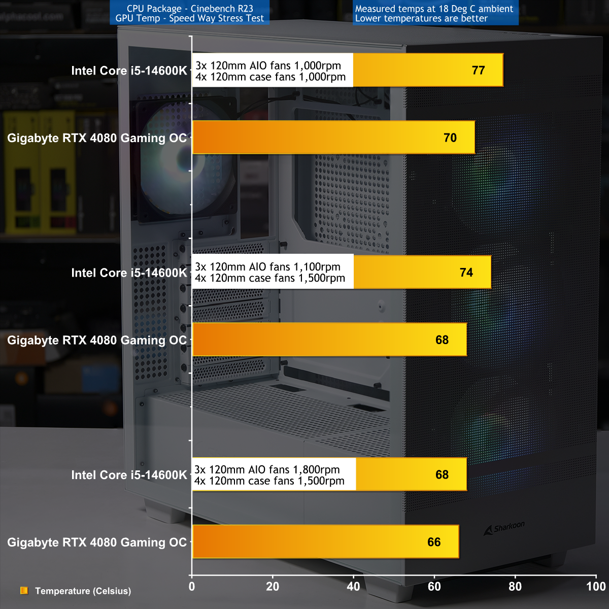 To put this case through its cooling paces we will be using a test system consisting of an Intel Core i5-14600K, Gigabyte GeForce RTX 4080 Gaming OC and an SSD. This system allows us to produce a substantial amount of heat and effectively test the Sharkoon Rebel C50 RGB’s cooling capabilities.