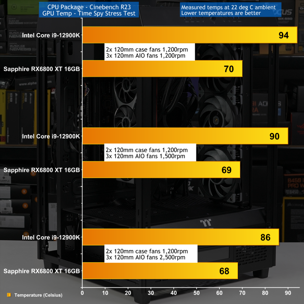 The airflow inside The Tower 500 is unconventional and if you wonder why we configured the case with the fans on the AIO cooler set to exhaust to the side the answer lies in this report HERE.