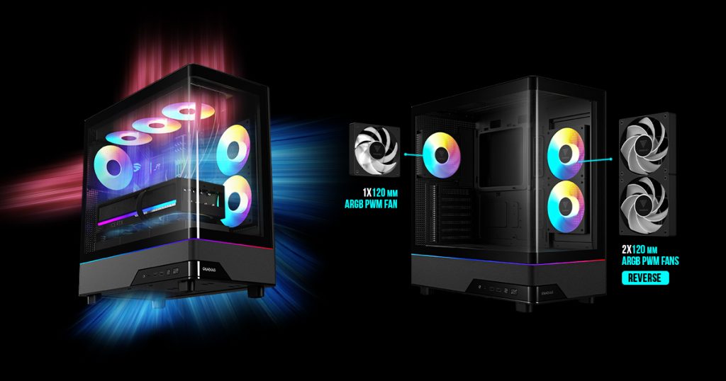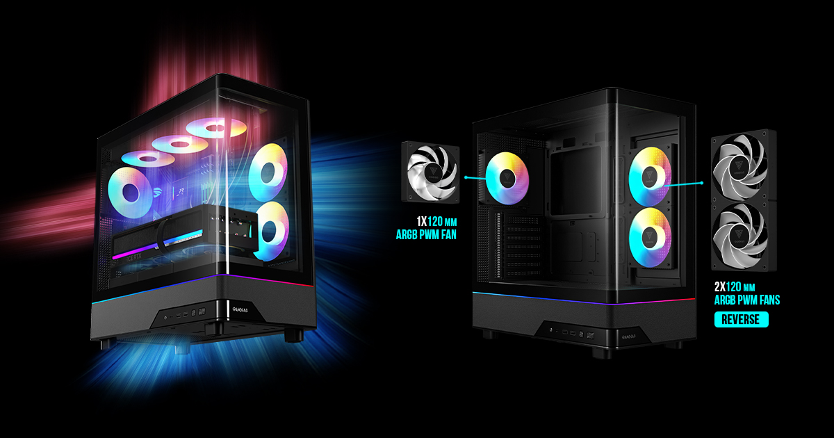 Cooling is handled by three pre‑installed NOTUS M1 ARGB PWM fans, with support for up to nine fans in total. The cases also include an integrated ARGB light strip and offer multiple radiator mounting points for liquid cooling setups.